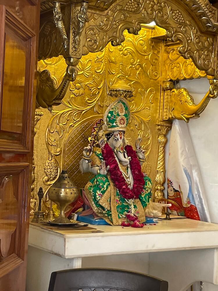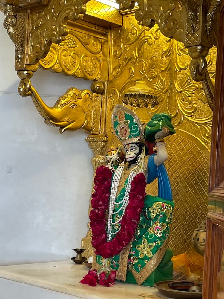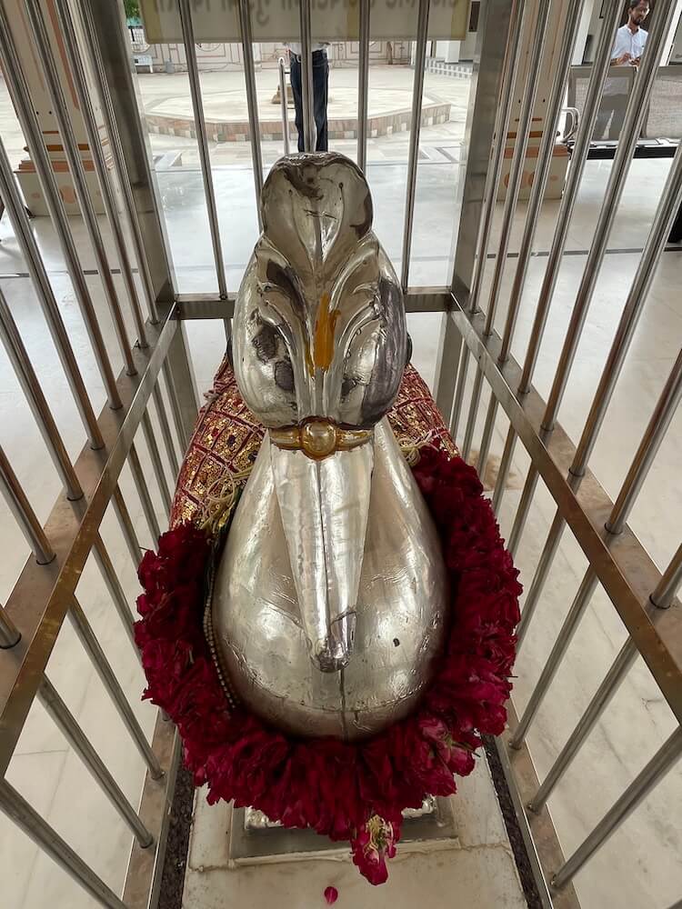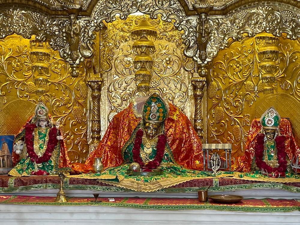 Inside the sabha mandap is a silver idol of a swan, the vehicle of the goddess. At the entrance to the antechamber are statues of temple guardians (dwarpalas) on either side of the pillars. To the left inside the antechamber is an idol of Ganesha within a golden shrine and to the right is an idol of Hanuman. The sanctum features a large marble pedestal intricately carved with images of a cow, swan and lion. Upon this pedestal rests a finely crafted and gold-plated shrine containing the central idol of Brahmani Mata. On her left is Umiya Mata and on her right is Chamunda Mata. All three goddesses wear ‘Mukhavata’ (face masks) and are adorned with golden crowns.