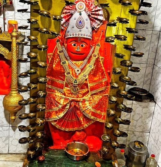 To the left of this Shiva shrine is the small temple of Chamatkarik Hanuman. Inside the sanctum, Hanuman’s idol sits on a raised pedestal (vajrapitha), and the pillars of the shrine are adorned with lamps. On an elevated platform beside the Hanuman idol is a golden shrine housing an idol of Lord Ganesha and a golden mace (gada), symbolising Hanuman’s strength. The unique feature of this temple is that the Shivalinga and Nandi are positioned in front of Hanuman’s idol, an unusual sight in Hanuman temples. Devotees often sit inside the sanctum, sharing their problems with the temple priest. Every Saturday, the temple is filled with devotees. Hanuman Jayanti, the birth celebration of Hanuman, is celebrated here with great enthusiasm. On this occasion, the temple is adorned with lights and flags. Mahashivaratri also attracts a large number of devotees.