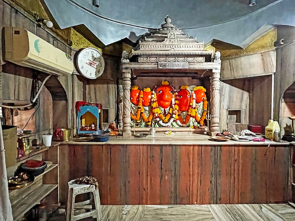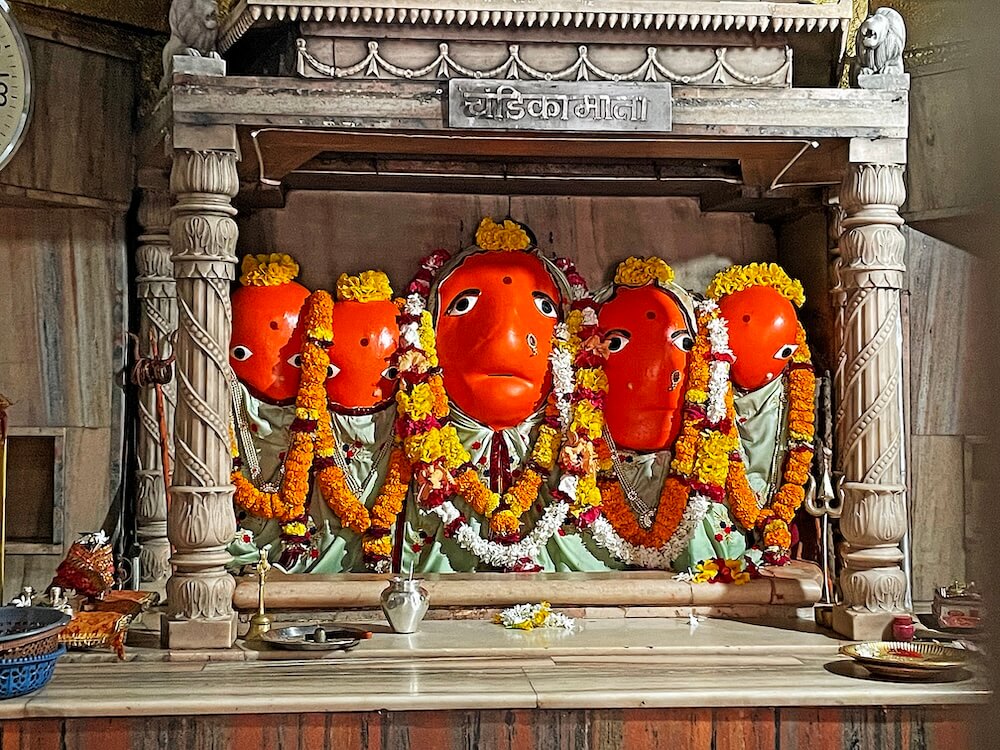 या गर्भगृहात वज्रपिठावरील मखरात चंडिका देवीची तांदळा स्वरूपातील मूर्ती आहे. या मूर्तीला पाच मुखे आहेत. गर्भगृहावर सुंदर कलाकुसर असलेले उंच शिखर आहे. या शिखरावर असलेल्या देवकोष्टकात गणपतीच्या मूर्ती व देवकोष्टकांवर सिंहशिल्पे आहेत. या शिखरावर मांगल्याचे प्रतिक असलेल्या कलशाच्या शेकडो प्रतिकृती कोरलेल्या आहेत. मंदिर परिसरात संकटमोचन हनुमान आणि शीतलामातेचीही मंदिरे आहेत. भाविकांच्या सुविधेसाठी येथे सुसज्ज भक्तनिवास, भोजनशाळा व गोशाळा आहे. उत्सवप्रसंगी या भोजनशाळेतून भाविकांना महाप्रसाद दिला जातो.