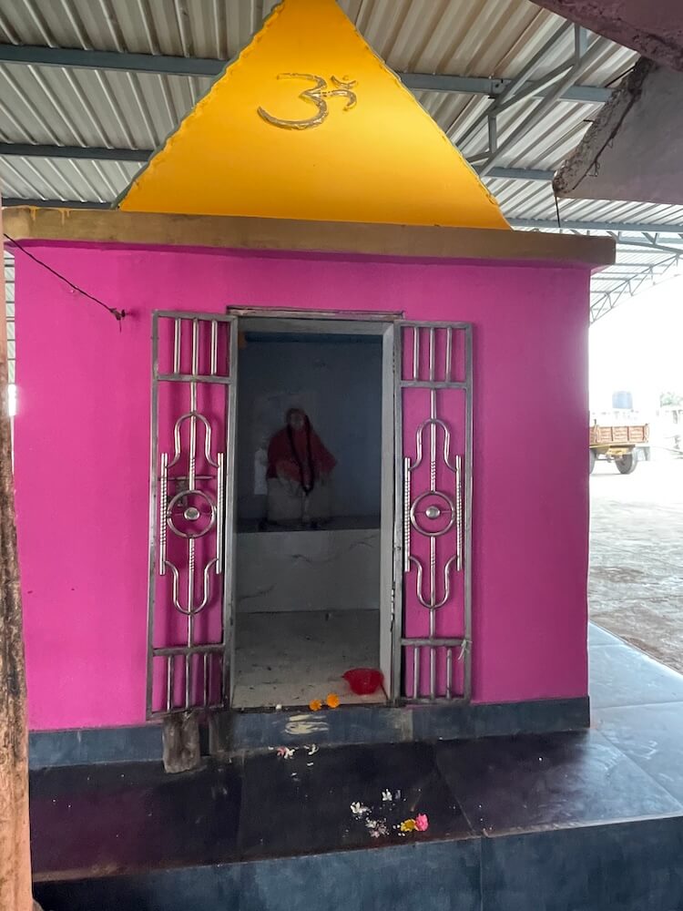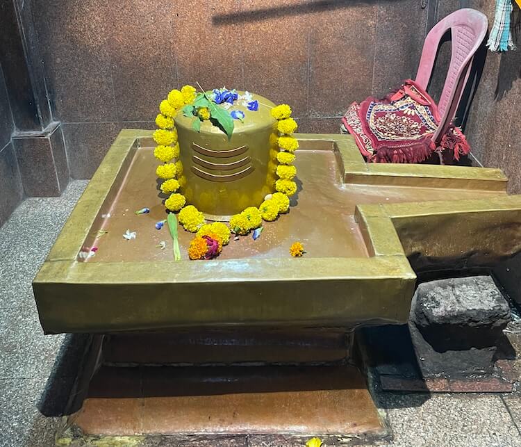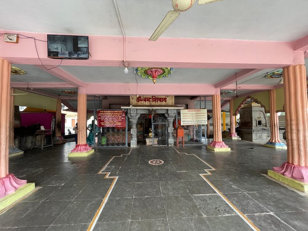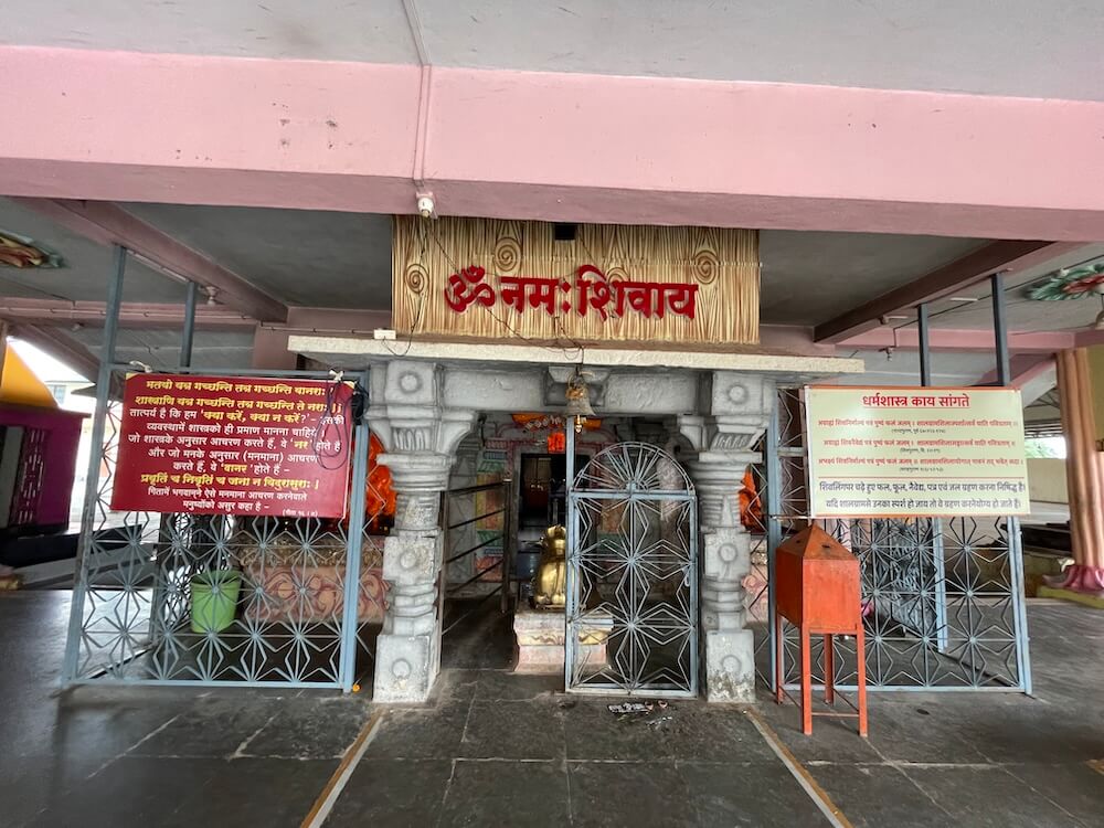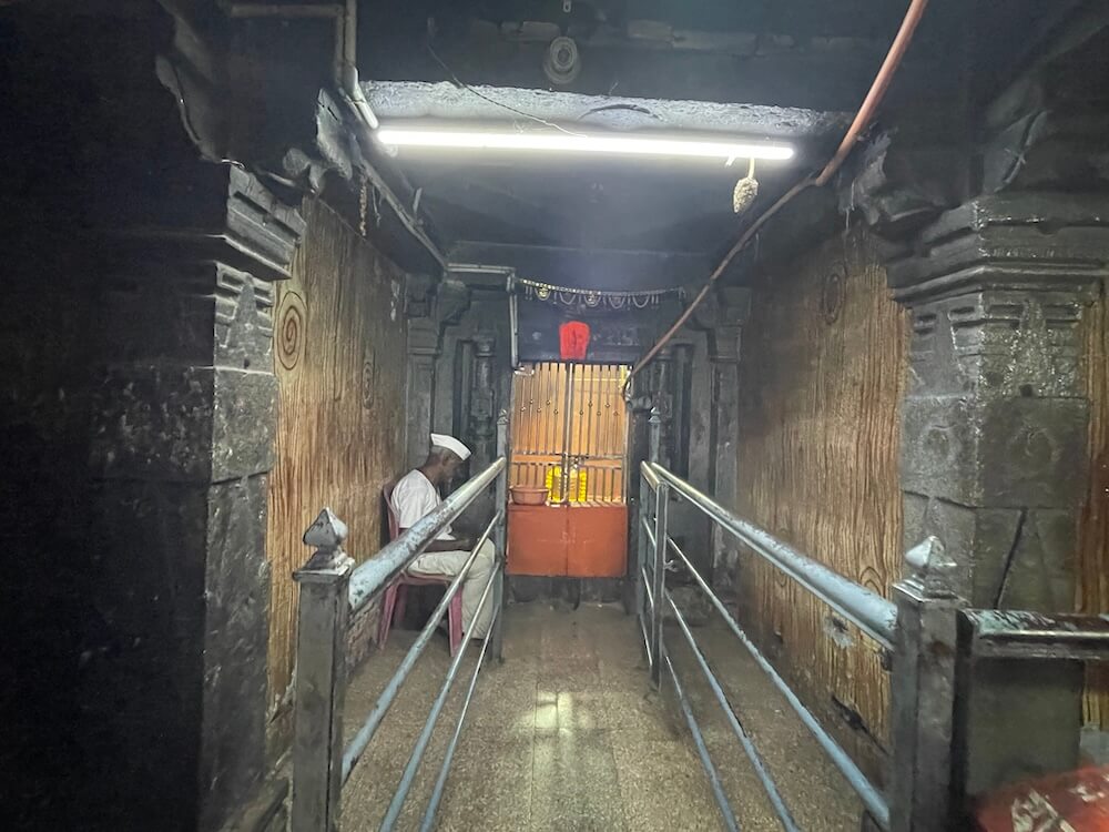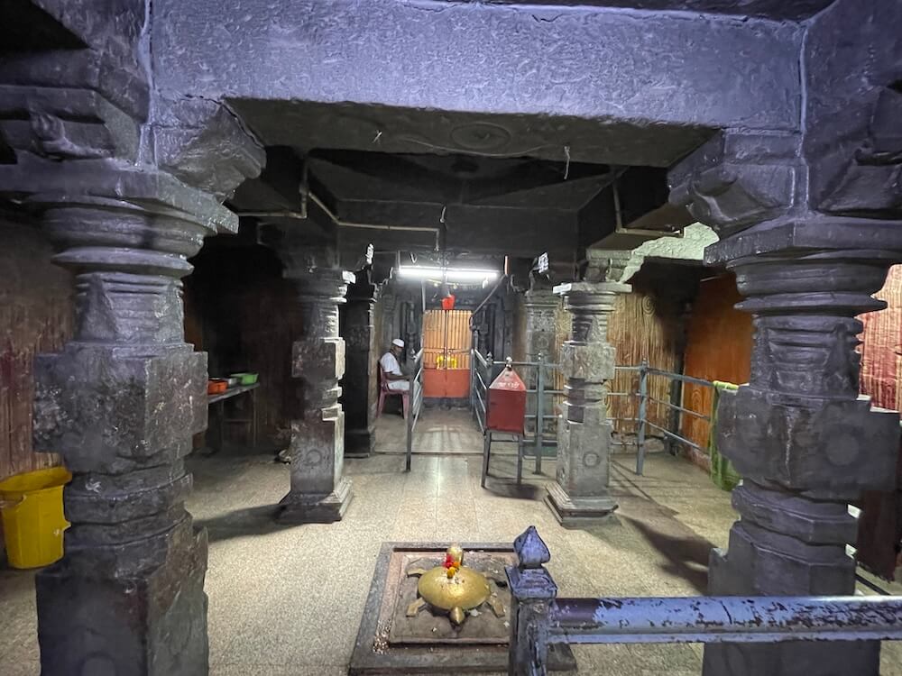 पुढे अरुंद अंतराळ व त्यापुढे गर्भगृहाचे प्रवेशद्वार आहे. गर्भगृहाच्या द्वारशाखांवर वेलबुट्टी नक्षी आहे, तर ललाटबिंबावर गणपती शिल्प आहे. गर्भगृहात जमिनीवर मध्यभागी उंच व चौकोनी शाळुंका असलेली मोठी शिवपिंडी आहे. शिवपिंडीवर छत्र धरलेला पितळी नाग आहे आणि जलधारा धरलेले तांब्याचे अभिषेक पात्र छताला टांगलेले आहे. गर्भगृहाच्या बाह्य बाजूला, मागे गोमुख प्रणाल आहे आणि त्यासमोर निर्माल्य कुंड आहे. मंदिराच्या मुखमंडप, सभामंडप व गर्भगृहाच्या छतावर शिखरे आहेत. मुखमंडपावरील गोलाकार शिखर लहान आहे. सभामंडपावर मध्यम आकाराचे घुमटाकार शिखर आहे, ज्यावर चारही दिशांना पशू शिल्पे आहेत. गर्भगृहाच्या छतावर सर्वात उंच शिखर आहे. त्यात चारही दिशांना देवकोष्ठके व त्यात देवमूर्ती आहेत. देवकोष्ठकांच्या छतावर देखील पशू शिल्पे आहेत. या शिखराच्या शीर्षभागी एकावर एक असे दोन आमलक आहेत, तर इतर दोन शिखरांच्या शीर्षभागी प्रत्येकी एक आमलक आहे. सर्व शिखरांवरील आमलकांवर कळस व ध्वजपताका आहेत.