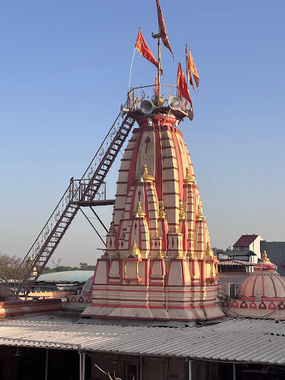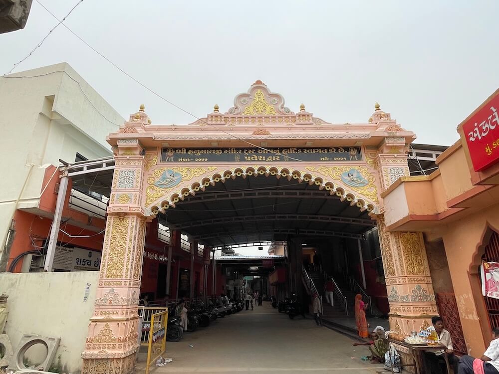 The main entrance is built from pink sandstone, with intricately carved columns and a relief sculpture of Hanuman above the gateway. After climbing 18 steps, one enters the complex, where a large assembly hall houses the white marble temple of Hanuman in the center. Stainless steel railings have been installed to manage the long queues of devotees. The temple walls, pillars of the viewing mandap and sanctum doorway all feature exquisite carvings. The spire is built in the urushringa style. The outer niches house idols of Ganesha, Baliyadev and Goddess Varahi. Within the sanctum, seated in a gold-plated canopy, is the self-manifested idol of Hanuman, smeared with shendur (vermilion). The idol wears a golden crown and necklace and a golden parasol shades his head. To the right of the main entrance lies the temple of Ankleshwar Mahadev.