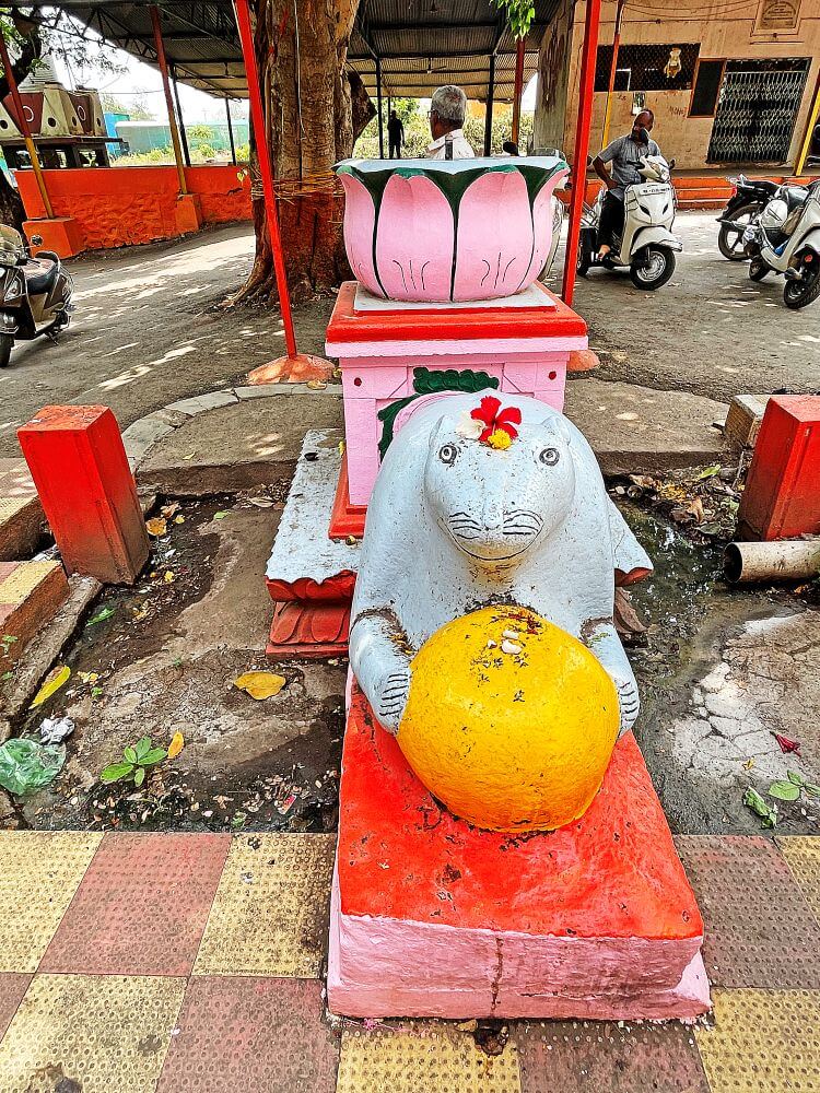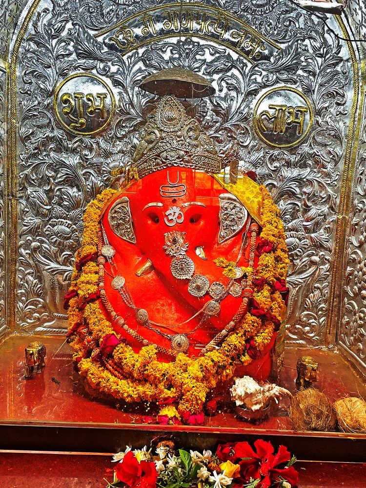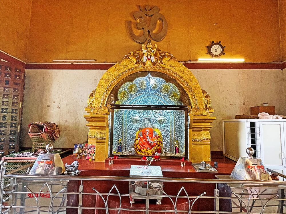 गर्भगृहात मागील भिंतीजवळील वज्रपिठावर दोन्ही बाजूस वामन स्तंभ त्यावर कमान असलेल्या मखरात गणेशाची शेंदूरचर्चित चतुर्भुज मूर्ती आहे. गणेशाच्या कानांना सोंडेला चांदीचे आच्छादन आणि डोक्यावर मुकूट आहे. मूर्तीच्या मागील चांदीच्या प्रभावळीवर वरील बाजूस अष्टविनायक मूर्ती खाली पानफुलांच्या नक्षी आहेत. मखरातील नक्षीदार स्तंभांवर पर्णलता, पुष्पलता नक्षी स्तंभावरील कणीवर गणेशाची मूर्ती आहे. स्तंभांवरील कमानीवर मध्यभागी कीर्तीमुख दोन्ही बाजूस पानाफुलांच्या नक्षी आहेत