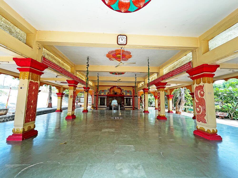 मंदिरापर्यंत जाणाऱ्या पायवाटेच्या दोन्ही बाजूस कठडे पलिकडे उद्यान आहे. प्रांगणात जागोजागी आसनांची व्यवस्था आहे. मंदिरासमोर तुलसी वृंदावन आहे. चौकोनी नक्षीदार तुलसी वृंदावनाच्या शिर्षभागी पद्माकार कुंडी आहे. वृंदावनापुढे वज्रपिठावर नंदीची काळ्या पाषाणातील मूर्ती आहे. नंदीपुढे लोखंडी कमानीला टांगलेली पितळी घंटा आहे. पुढे मंदिराचा खुल्या स्वरूपाचा सभामंडप आहे. सभामंडपात प्रत्येकी पाच नक्षीदार चौकोनी स्तंभांच्या चार रांगा आहेत. स्तंभपाद चौकोनी दोन थरांचे आहेत. स्तंभांचा खालील भाग चौकोनी कुंभासारखा आहे. त्यावर सोनेरी रंगाच्या पानाफुलांच्या नक्षी आहेत. स्तंभदंडावर त्रिशूलडमरू सारख्या नक्षी वरील भागात पाना फुलांच्या नक्षी रंगविलेल्या आहेत. स्तंभांच्या शीर्षभागी कणी, त्यावर तुळई तुळईवर छत आहे. वितानावर चक्राकार नक्षी आहेत. सभामंडपातील बाह्य बाजूचे सर्व स्तंभ एकमेकांना महिरपी कमानीने जोडलेले आहेत