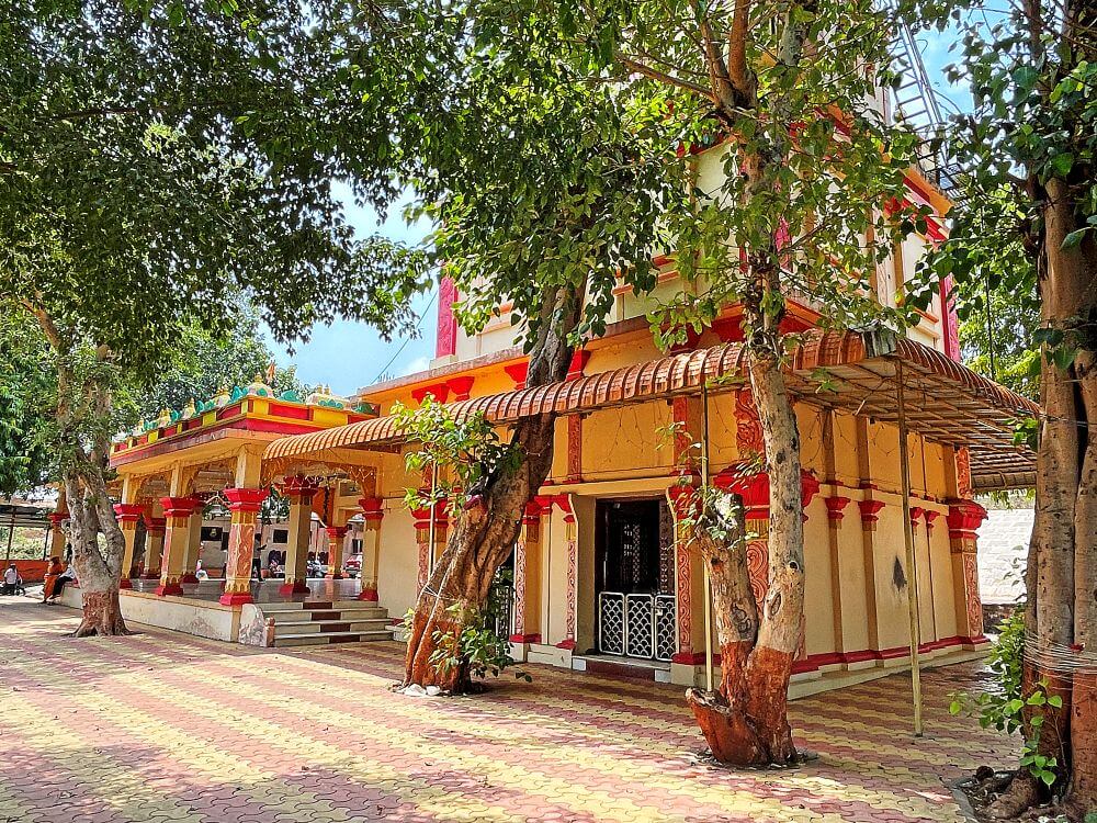 मंदिराच्या आवारभिंतीच्या आतील प्रांगणापर्यंत पक्का रस्ता आहे. प्रांगणासमोर प्रशस्त वाहनतळ आहे. प्रांगणातून मंदिरापर्यंत जाण्यासाठीच्या पायवाटेवर दोन्ही बाजूला चौकोनी स्तंभ त्यावर सज्जा असलेली स्वागतकमान आहे. कमानीच्या दोन्ही स्तंभांवर पायाकडून वर कमळ फुलांच्या नक्षी, आदिवासी शैलीतील उठाव चित्रे, चक्र, गंगायमुना वर पुन्हा कमळ फुलांच्या नक्षी आहेत. कमानीच्या सज्जावर दोन्ही बाजूस सोंडेत माळ धरलेले गजराज मध्याभागी कमळाच्या फुलावर बसलेली लक्ष्मी, असे गजलक्ष्मी शिल्प आहे