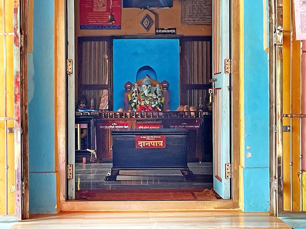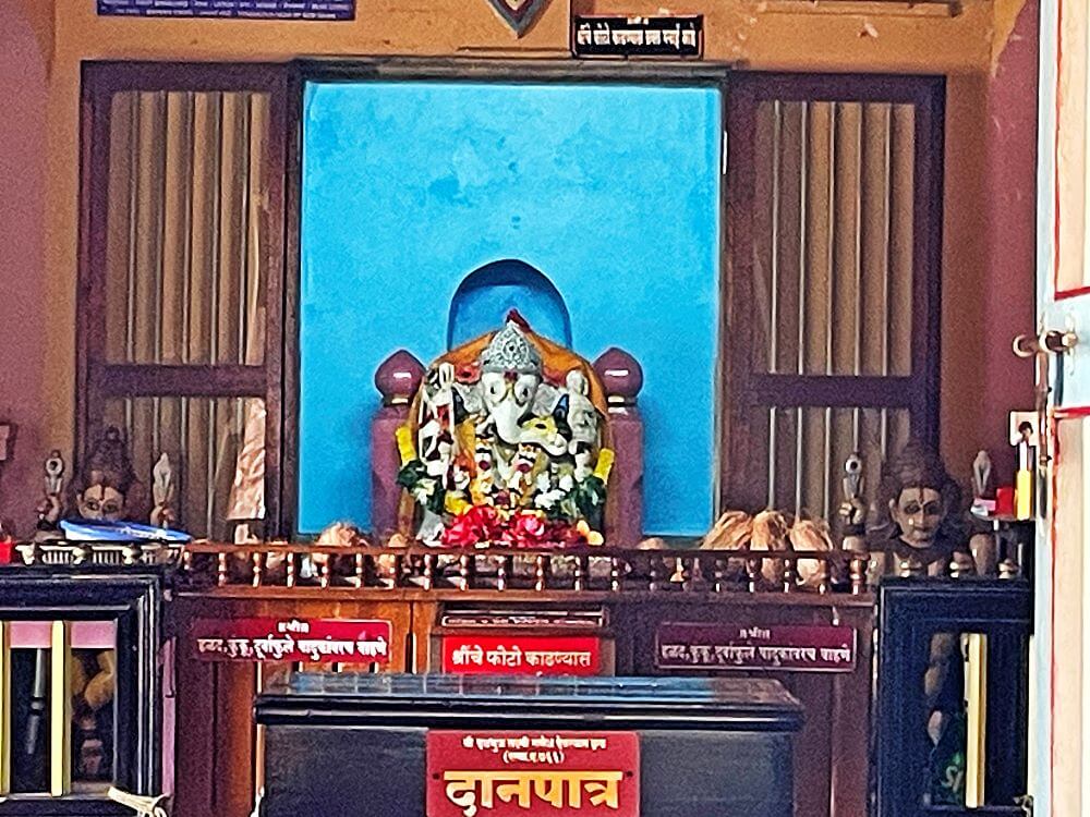 सिद्धलक्ष्मी आहे. उजवा पाय गुडघ्यात दुमडून तो जमिनीवर टेकवलेला आहे. उजव्या पायापाशी मूषकराज आहे. मूर्तीला दररोज विविध वस्त्रालंकारांनी सजविले जाते. या मूळ मूर्तीच्या समोर एक गणेशाची तांब्याची मूर्ती व त्यापुढे पादुका आहेत.