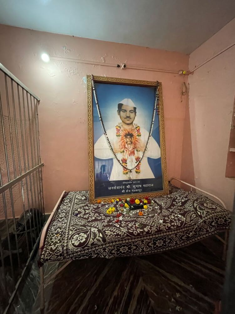 या कक्षात मागील भिंतीवर सुभाष महाराजांचे चित्र असलेली मोठी प्रतिमा आहे. पुढे गर्भगृह आहे. गर्भगृहाच्या लाकडी द्वारशाखांवर पानाफुलांची नक्षी व प्रवेशद्वारास चांदीच्या नक्षीदार झडपा आहेत. गर्भगृहात मध्यभागी सुभाष महाराजांची समाधी व मागील भिंतीलगत वज्रपिठावर महाराजांची ध्यानस्थ मूर्ती आहे. मूर्तीवर वस्त्रे व डोक्यावर फेटा आहे. गर्भगृहाच्या बाह्यबाजूने प्रदक्षिणा मार्ग आहे. गर्भगृहाच्या छतावर तीन थरांचे चौकोनी शिखर आहे. शिखरात स्तंभ नक्षी व पद्मदल नक्षी आहे. शिखराच्या शीर्षभागी स्तूपिका व त्यावर कळस आहे.