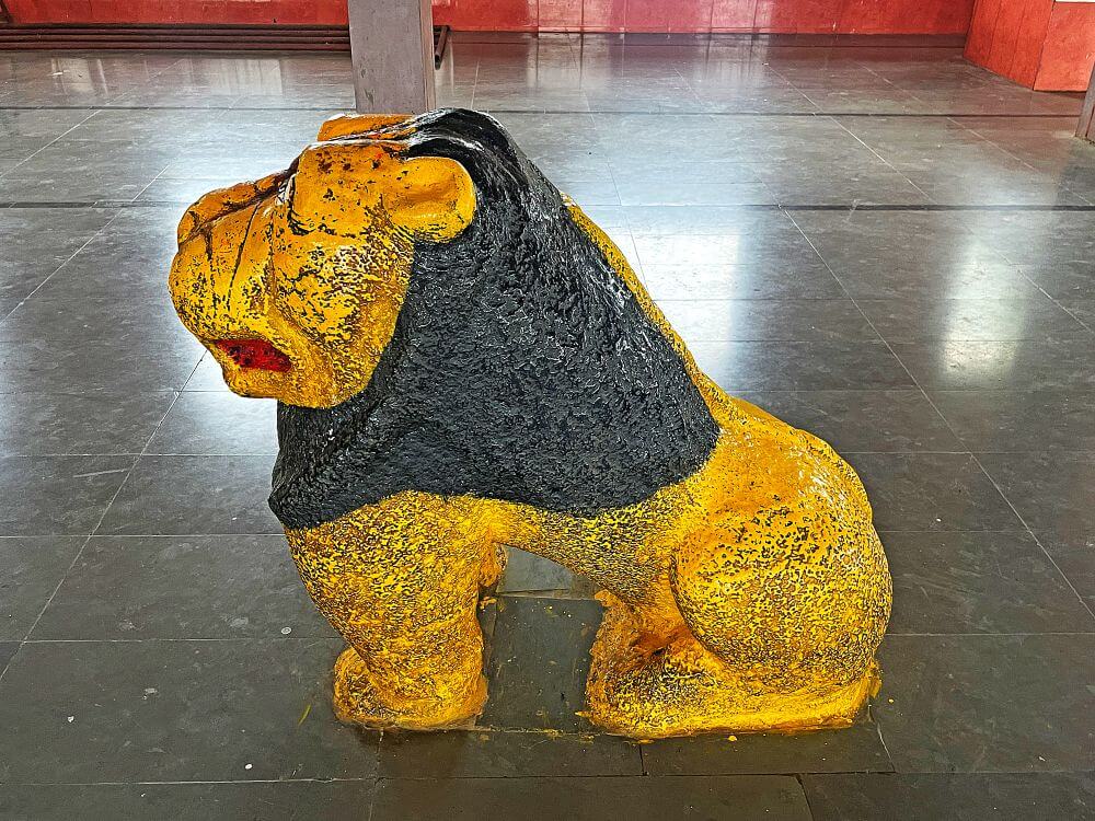 मुखमंडपाच्या छतावर मध्यभागी चौकोनी मंदिर प्रतिकृती व त्यावरील शिखरावर आमलक आणि कळस आहे. या मंदिर प्रतिकृतीच्या दोन्ही बाजूला सिंहशिल्पे आहेत. मुखमंडपापुढे सभामंडपाचे प्रवेशव्दार आहे. मुखमंडपापेक्षा उंचावर असलेल्या सभामंडपाच्या प्रवेशद्वारास तीन पायऱ्या आहेत. सभामंडपात प्रवेशद्वारासमोर जमिनीवर यज्ञकुंड व त्यापुढे सिंहशिल्प आणि पितळी कासव आहे. सभामंडपात प्रत्येकी आठ चौकोनी स्तंभांच्या चार रांगा आहेत. बाह्य बाजूचे स्तंभ भिंतीत आहेत. स्तंभांवर तुळई व तुळईवर छत आहे. बंदिस्त स्वरूपाच्या सभामंडपात उजेड व हवा येण्यासाठी वातायने आहेत. सभामंडपास उजव्या व डाव्या बाजूला आणखी दोन दारे आहेत.