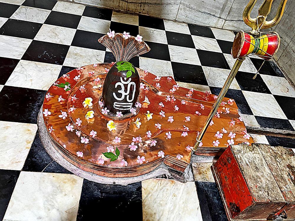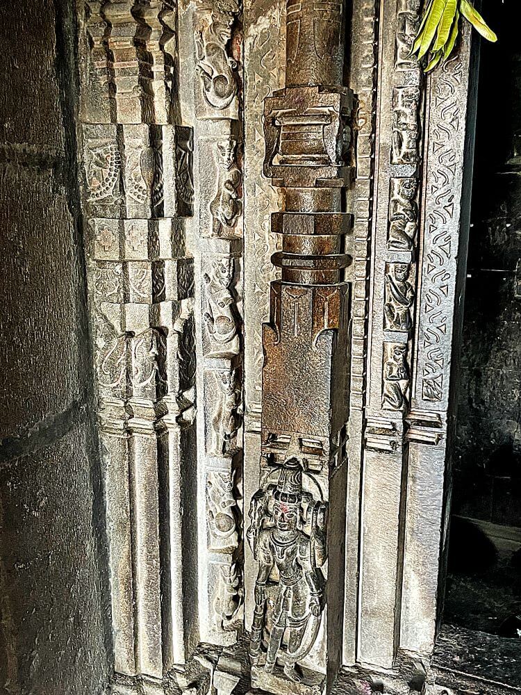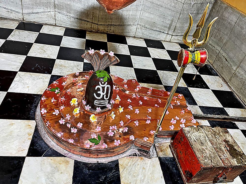 मुख्य सभामंडपात प्रवेश केल्यावर मंदिराच्या प्राचिनत्वाची प्रचिती येते. भिंतींवर असलेल्या कमानीतील देव-गंधर्वांची उठावशिल्पे व तेथील नक्षीकाम वैशिष्ट्यपूर्ण आहे. सभामंडपातून काही पायऱ्या उतरून दगडी गर्भगृहातील शिवपिंडीपर्यंत जाता येते. सुबक शिवपिंडी, बाजूला धातूचे शिवलिंग, त्यावर महादेवाचा मुखवटा, शेषनागाने उभारलेले त्यावर फण्याचे छत्र, एका बाजूस त्रिशूल आणि त्यावर लावलेले डमरू येथे पाहता येतात.