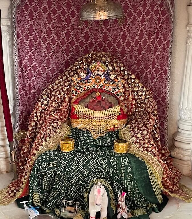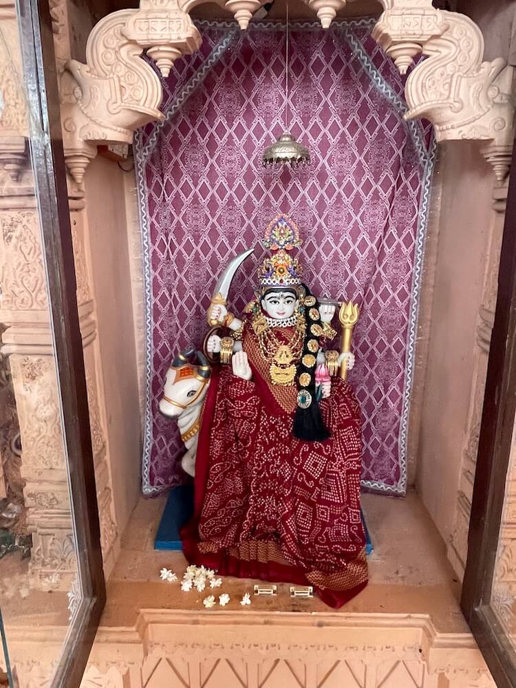 adorned with a brightly colored saree. In front of her sits a horse idol. The shrine on the left houses a four-armed standing idol of Goddess Ambaji, depicted with weapons. Elegantly adorned in fine attire and ornaments, she wears a magnificent crown. The shrine on the right features the idol of Sati Mata. A sacred flame (jyot) continuously burns before the goddess. The smaller shrines within the sabhamandap house deities like Amba Mata, Umiya Mata, Bhairav and Ganesh.