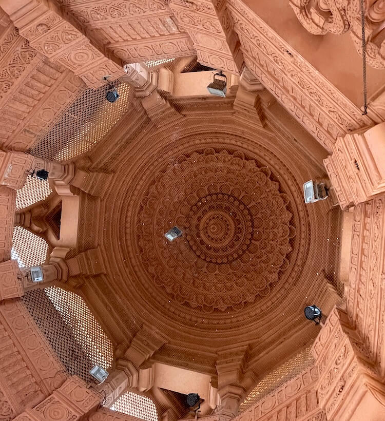 The columns in both the entrance and assembly halls bear intricate carvings of surasundaris (celestial maidens) in various poses. These pillars also feature delicately sculpted makartoran (arch decorations). The ceiling of the sabhamandap has ornamentation resembling a chandelier. The hall remains airy and well-lit, with latticework on the upper sections. Above it rises a layered spire shaped like a step-pyramid, topped with a carved amala and a golden urn.