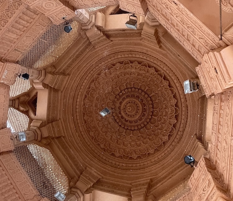 Further along stands the expansive Dolamata temple, constructed using red sandstone from Rajasthan, influenced by Dravidian architectural aesthetics. The temple’s entrance has a towering gopuram-like structure. The doorway, pillars and columns are adorned with exquisite carvings. At the base of the door’s pillars are guardian sculptures, while the lintel showcases an image of Goddess Gajalakshmi. High-relief carvings of Ganesha, elephants,