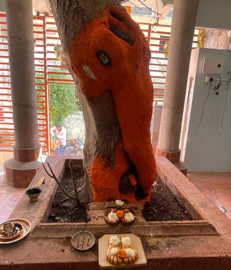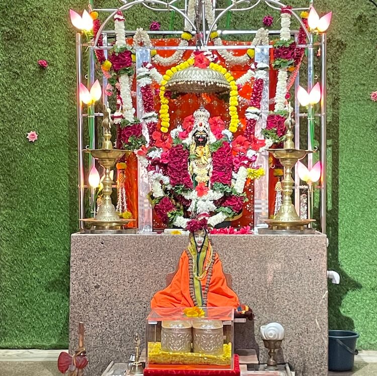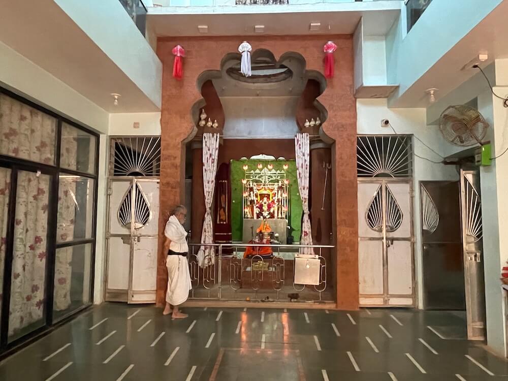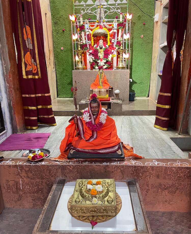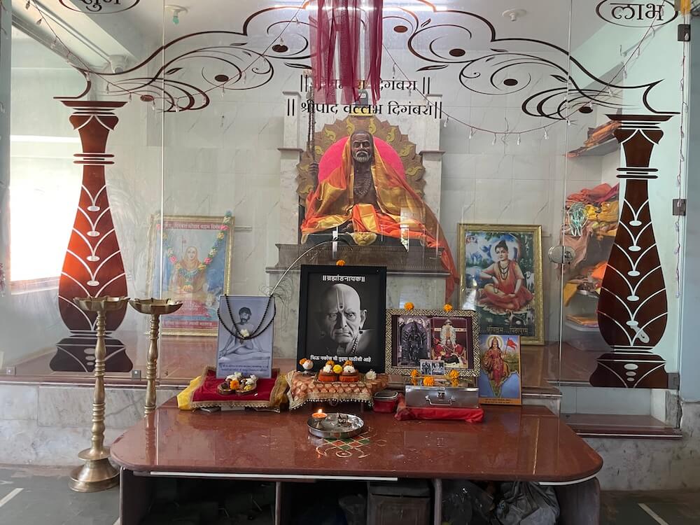 In a space to the right of the assembly hall, there is a strikingly life-like idol of Tembe Maharaj, alongside images of Shripad Shrivallabh, Swami Samarth, Narasimha Saraswati, Bharatmata and Dattatreya. A wooden kuti (hut) nearby provides a serene space for meditation. A short distance from the temple lies the Narmada ghat (riverbank steps), from where the holy site of Nareshwar can be reached in an hour by boat.