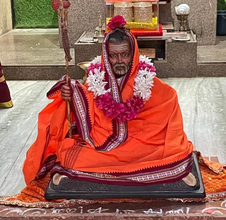 A cow stands by the left foot and a dog, representing the Vedas, stands by the right. The silver prabhavali (aureole) behind the deity is intricately carved with vine patterns, peacocks and cows. Below, on the main pedestal, sits a marble idol of Narasimha Saraswati, the 14th-century incarnation of Dattatreya. Before him rest padukas gifted to Pratap Maharaj by a devotee from Miraj. These padukas, kept in a box, are worshipped daily.