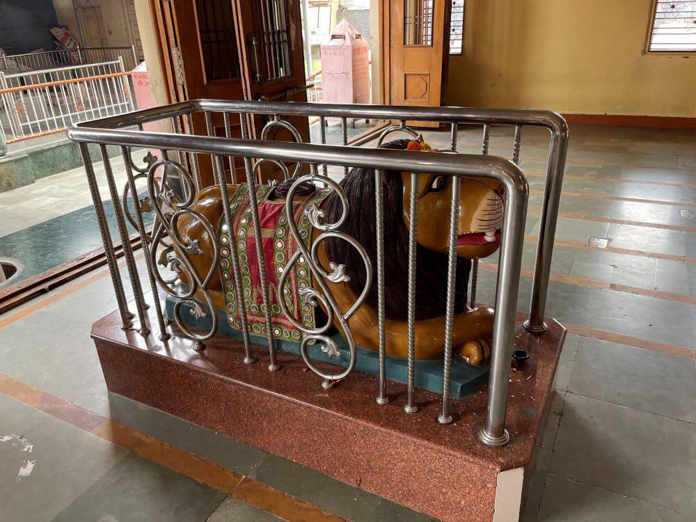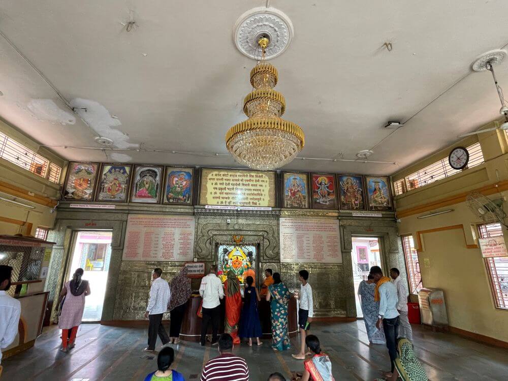 शिखराच्या शीर्षभागी एकावर एक असे दोन आमलक व त्यावर कळस आहे. सभामंडपास तीन प्रवेशद्वारे आहेत. मध्यभागी असलेल्या मुख्य प्रवेशद्वाराच्या दोन्ही बाजूस द्वारपाल, समोर जमिनीवर कूर्ममूर्ती व ललाटबिंबावर असलेल्या देवकोष्टकात गणपतीची मूर्ती आहे. हा सभामंडप बंदिस्त स्वरूपाचा आहे व त्यात हवा व उजेड येण्यासाठी गवाक्ष आहेत. सभामंडपाच्या मध्यभागी एका चौथऱ्यावर देवीचे वाहन सिंहाची मूर्ती आहे.