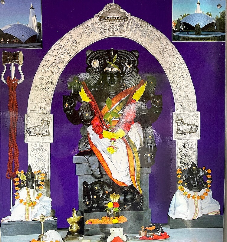 In the sanctum, the black stone Dakshinamurti idol sits regally on a marble pedestal. The deity, depicted with four arms holding serpents and posed in a blessing gesture, stands over a demon symbolizing ignorance. The temple celebrated its 50th anniversary on February 5, 2016, with pujas and havans. However, the grand event was held on February 22, 2016, according to the Hindu calendar. On that day, in the presence of Vadodara’s royals and dignitaries, the idol was ceremonially anointed and adorned with a 5.8 kg silver arch (prabhavali) engraved with images of Nandi, Matsya and Hindu symbols. The words “Om Namah Shivaya” are inscribed at the top.
