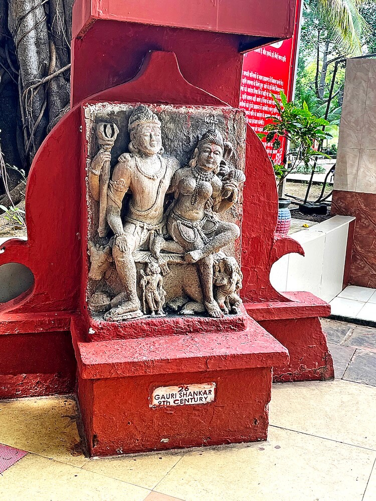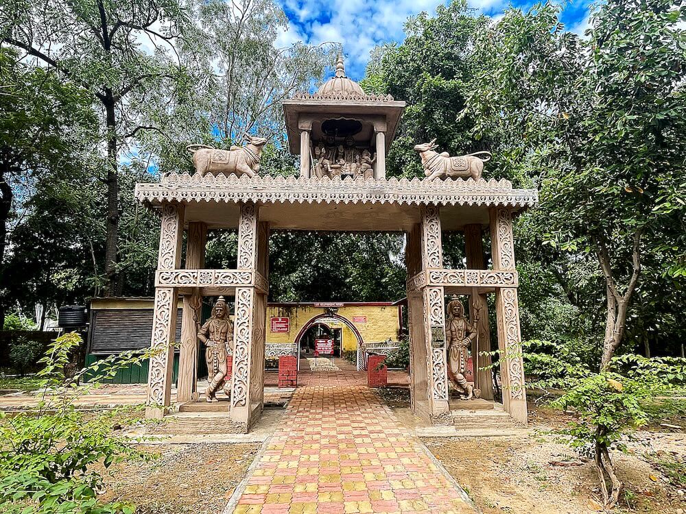 As one enters through the EME main gate, a pair of cannons greets visitors, followed by a tank stationed near the parking area. A short walk leads to the eye-catching temple entrance, flanked by standing sculptures of Lord Shiva and adorned with carvings of Nandi above. In the central niche sits a beautiful statue of Shiva and Parvati, holding baby Ganesha. Just beyond the entrance, rectangular gates having stone slabs welcome visitors into the courtyard, which is lined with gardens and towering trees. Among these are seven banyan trees, each symbolically named after the Sapta Rishis and their consorts.