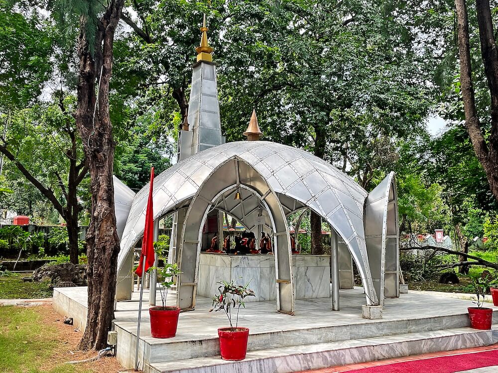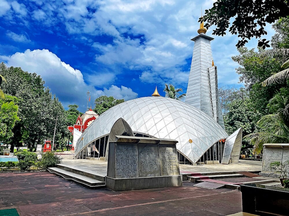 Situated on a 75-by-75-foot pedestal the temple features a sabhamandap (assembly hall) built in geodesic dome style and a 70-foot shikhara rising above the sanctum. The dome, crafted from aluminium-covered wooden frames with iron ribs and supported by five iron pillars, combines strength and grace. The iron-framed shikhara is also covered in aluminium, enhancing its futuristic appearance. Religious inclusivity is built into the temple’s very design. The kalasha atop the dome represents Hinduism, while the dome itself reflects Islamic architectural elements. The 22-meter minaret near the dome symbolizes Christianity, crowned by a golden structure that signifies Buddhism. The arched entrance mirrors Jain traditions and the sacred fire within the temple denotes the Zoroastrian faith.