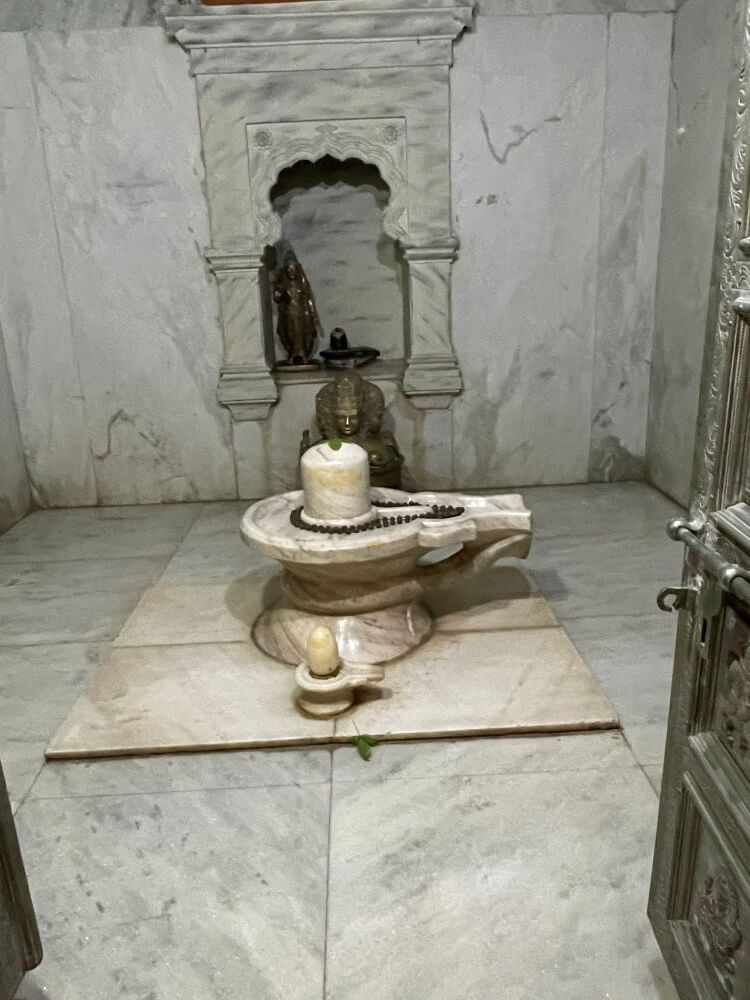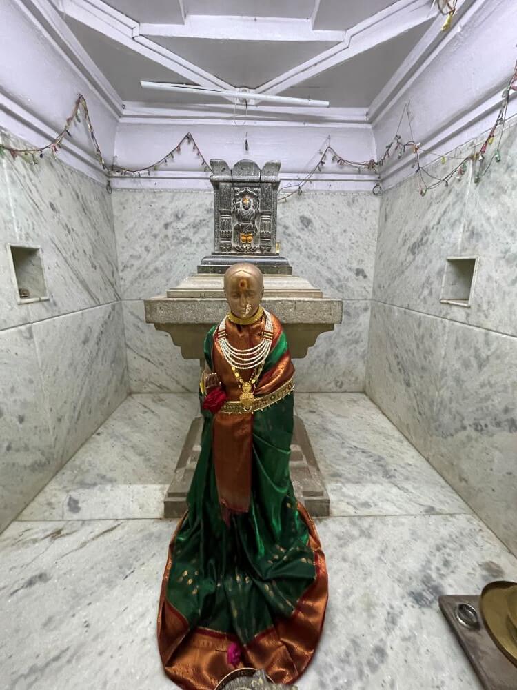 पुढे गर्भगृहाचे प्रवेशद्वार आहे. गर्भगृहाच्या आतील भिंती व जमीन शुभ्र संगमरवरी फरशी आच्छादित आहे. जमिनीवर मध्यभागी संगमरवरी शिवपिंडी आहे. मंदिरात मागील भिंतीलगत घारापुरी येथील त्रिमूर्तीची प्रतिकृती व भिंतीतील देवकोष्टकात श्रीरामाची मूर्ती आणि शिवपिंडी आहे. देवकोष्टकावरील सज्जावर शिवपार्वतीच्या मूर्ती आहेत. मंदिरात डाव्या बाजूच्या देवकोष्टकात नृसिंह भगवान व लक्ष्मी यांच्या मूर्ती व उजवीकडे त्रिमुखी दत्तात्रेयांची मूर्ती आहे. गर्भगृहाच्या छतावर चार थरांचे द्रविडी शैलीतील चौकोनी शिखर आहे. संपूर्ण शिखरावर विविध देवी देवतांची शिल्पे व स्तंभनक्षी आहेत. शिखराच्या वरील घुमटाकार भागावर स्तुपिका व कळस आहे. या मंदिराच्या शेजारी गजानन महाराजांचे पिता शिवानंद स्वामी यांचे समाधीमंदिर आहे. मंदिराच्या प्रवेशद्वारात दोन्ही बाजूला दोन नक्षीदार चौकोनी स्तंभ व त्यांवर सज्जा आहे. सज्जावर शेषशाही विष्णू व विष्णूच्या पायाजवळ लक्ष्मी असे शिल्प आहेत. या शिल्पाच्या दोन्ही बाजूस दोन ऋषीशिल्पे आहेत. सभामंडप व गर्भगृह अशी रचना असलेल्या मंदिराच्या सभामंडपात गजाजन महाराज यांची प्रतिमा आहे. गर्भगृहात शिवानंद स्वामी यांच्या चैतन्य पादुका, शेजारी गजानन महाराजांचा संगमरवरी पूर्णाकृती पुतळा व सवत्स कामधेनू शिल्प आहे. या मंदिराच्या बाजूला महाराजांच्या मातोश्री सोनामाता यांचे समाधीमंदिर आहे.