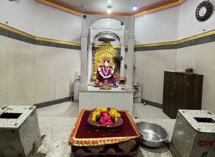 मंदिराच्या बाजूला कालिंका नदी वाहते. शेगावमधील मंदिराप्रमाणेच येथील मूर्तीची उंची २.५ फूट आहे आणि मूर्तीची दिशाही समान आहे. शेगावप्रमाणेच येथेही राममंदिर आहे. याशिवाय येथेही अखंड ज्योत तेवत असते आणि भजन, आरती, अन्नदान व अन्य नित्यक्रमही शेगावप्रमाणेच होतात. दर गुरुवारी येथे महाआरती व अन्नदान होते.