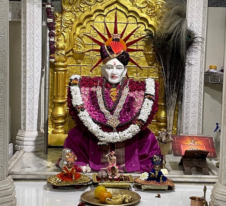 या मूर्तीवर सुंदर कलाकुसर असलेला चांदीचा मुकुट आहे. मूर्तीसमोरच गजानन महाराजांची लहान संगमरवरी मूर्ती आहे. तिच्या डावीकडे हनुमान तर उजवीकडे बालकृष्णाच्या पंचधातूच्या मूर्ती आहेत. गर्भगृहातील वितानावर सुंदर नक्षी कोरलेली आहे. गर्भगृहातून बाहेर आल्यावर दुसऱ्या जिन्याने पुन्हा मंडपात येता येते. बाहेर येण्याच्या दरवाजाच्या वरील बाजूस शिवशंकरांची मूर्ती आहे.