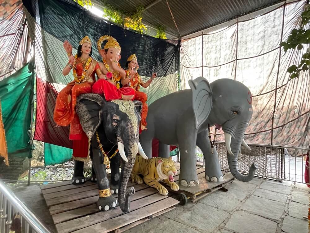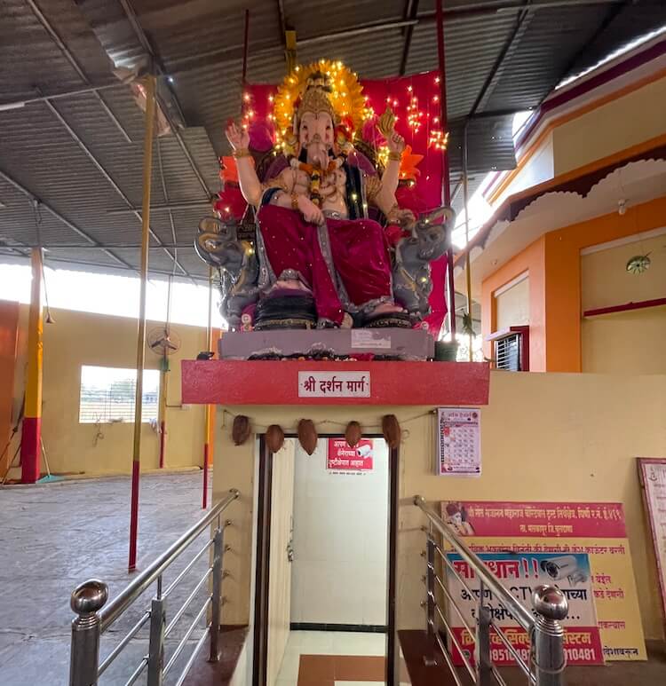 या मंदिराच्या उजव्या बाजूस गजराजाचे शिल्प आहे. या शिल्पाच्या उजवीकडे दुसऱ्या गजराजाच्या शिल्पावर गणेशाची मूर्ती विराजमान आहे आणि गणेशाच्या दोन्ही बाजूंना रिद्धी-सिद्धी आहेत. ही मूर्ती असलेल्या भागात चारही बाजूंना स्टेनलेस स्टीलचे रेलिंग बसवण्यात आले आहे. नजीक असलेल्या औदुंबर वृक्षाच्या खाली चारही बाजूंनी श्रीदत्तात्रेय, गजानन महाराज, स्वामी समर्थ तसेच साईबाबांच्या प्रतिमा ठेवण्यात आल्या आहेत. या वृक्षाच्या दोन्ही बाजूंना वाघाची शिल्पे आहेत. परिसरात सोमेश्वर महादेवाचे स्थान आहे. येथील चौथऱ्यावर शिवलिंग व त्यासमोर नंदीची मूर्ती आहे.