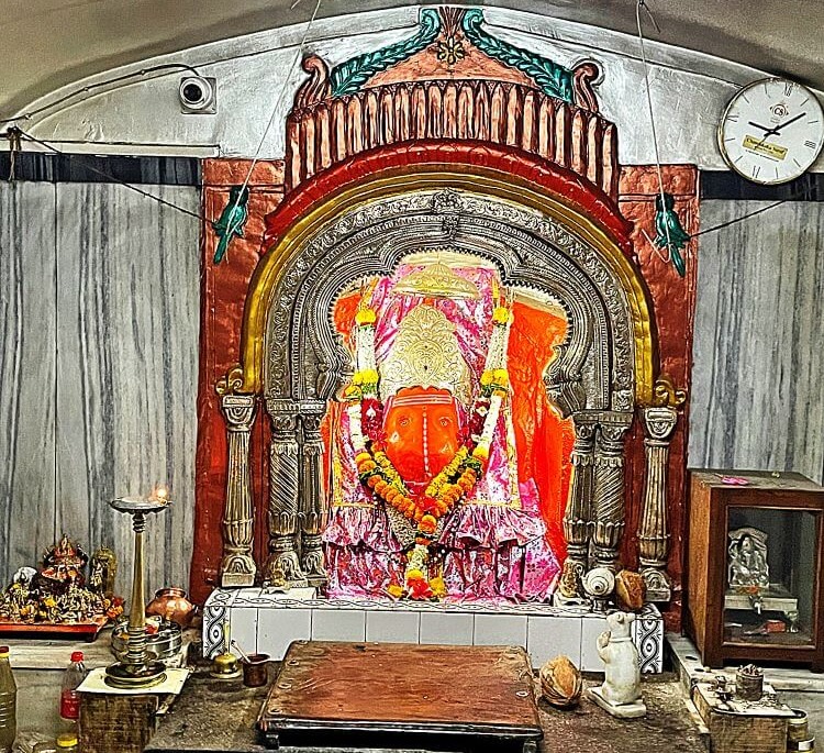 गर्भगृह में सिंदूर-चर्चित गणपति की मूर्ति चाँदी के मुकुट से अलंकृत रूप में विराजमान है। मूर्ति के पीछे चाँदी के पत्र (चादर) पर की गई मनोहर नक्काशी की सजावट है। मंदिर का सभामंडप खपरैल वाला है और गर्भगृह के शिखर पर बने देवकोष्टकों में विभिन्न देवी-देवताओं की मूर्तियाँ हैं।
