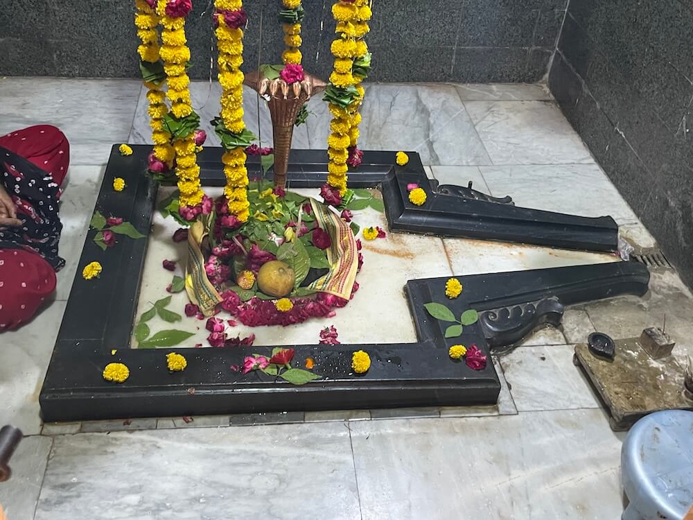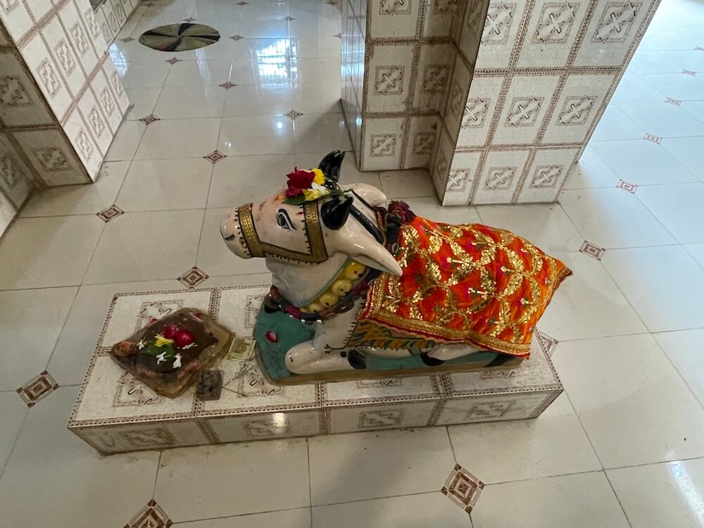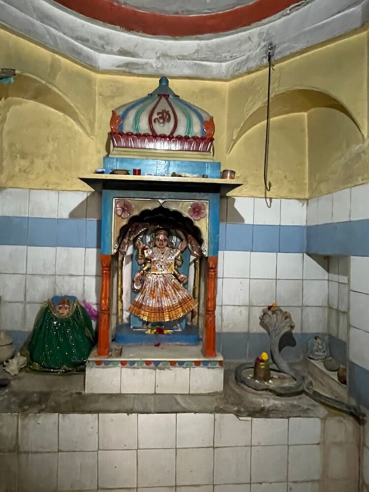 Inside, to the left, is a platform with an idol of Gauri Shankar, seated on Nandi, holding a trident with the Ganga flowing from his hair. Beside him is Parvati and nearby, a vermillion-smeared idol of Hanuman.