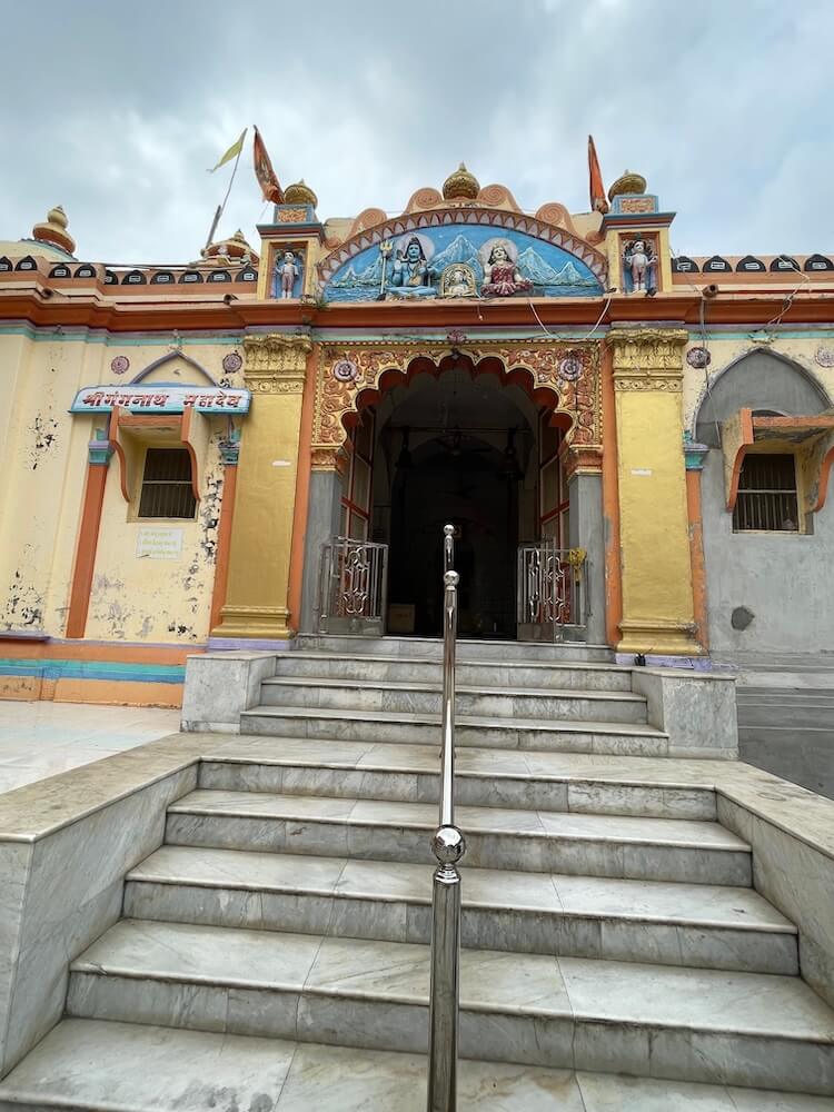Straight ahead, on a raised platform, stands the Gangnath Mahadev Temple, consisting of an assembly hall, sanctum and subsidiary shrines. Eight steps lead to the intricately carved arched entrance. Above it is a relief of Shiva, Parvati and Ganesha and smaller sculpted figures of batu (young sages). The sanctum features a tall Urushringa-style spire with a broad amalaka and a kalash at the top.