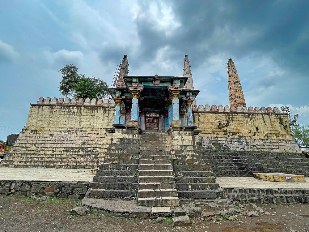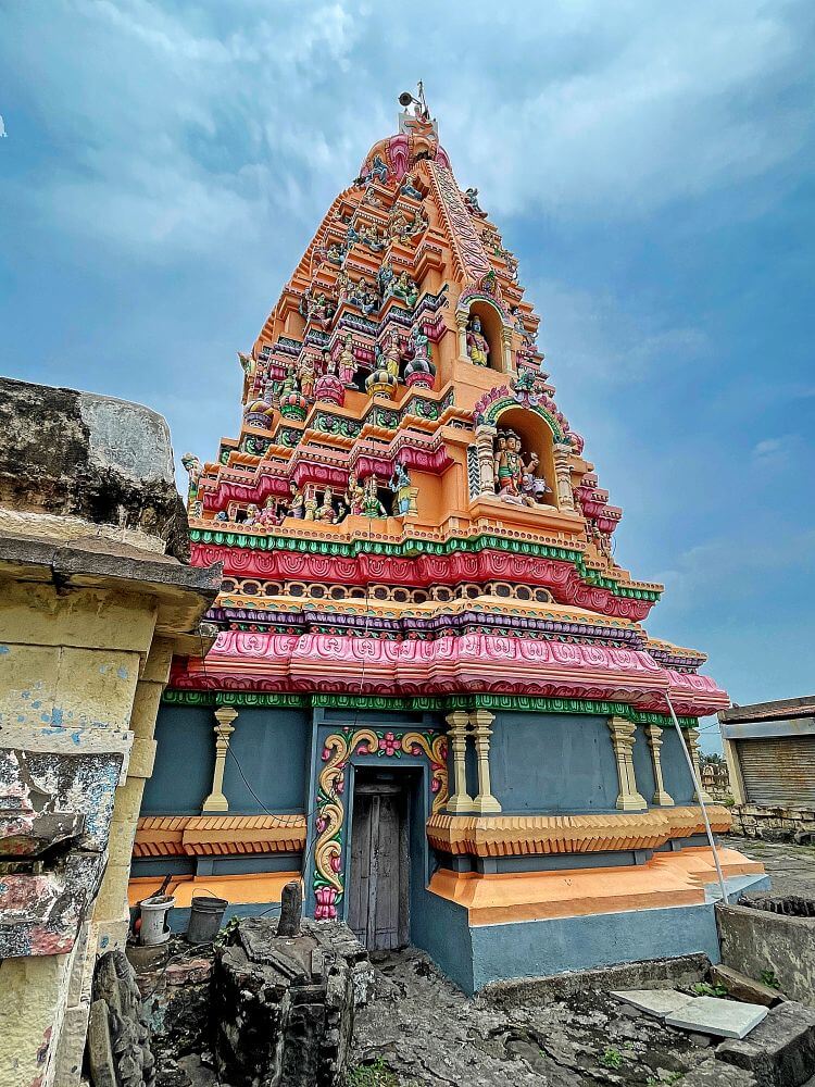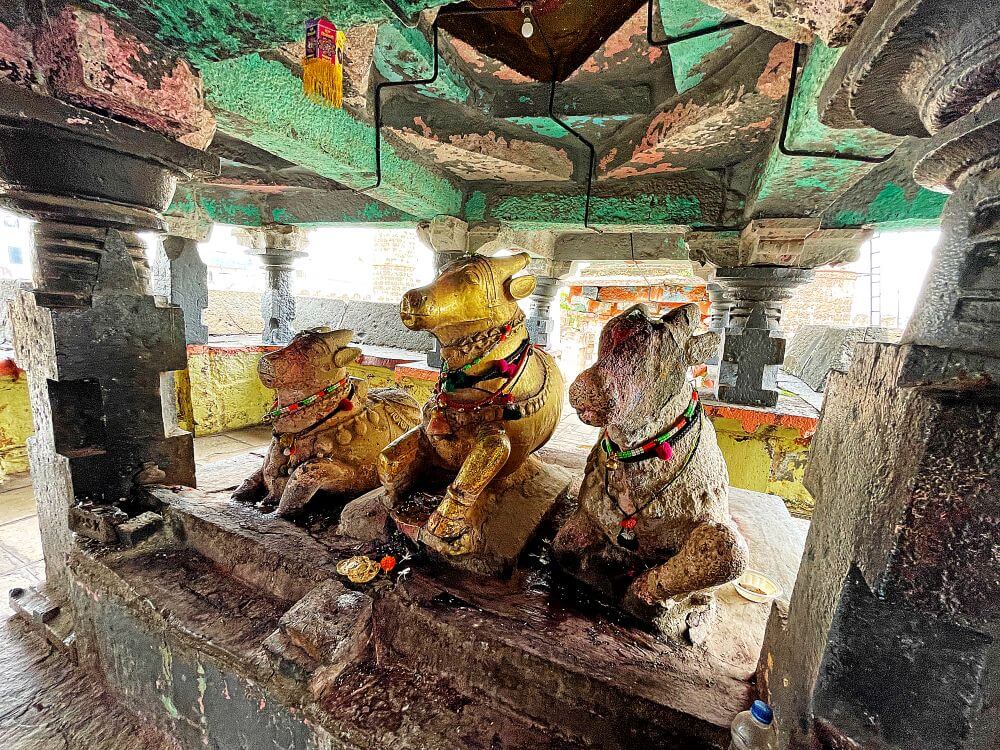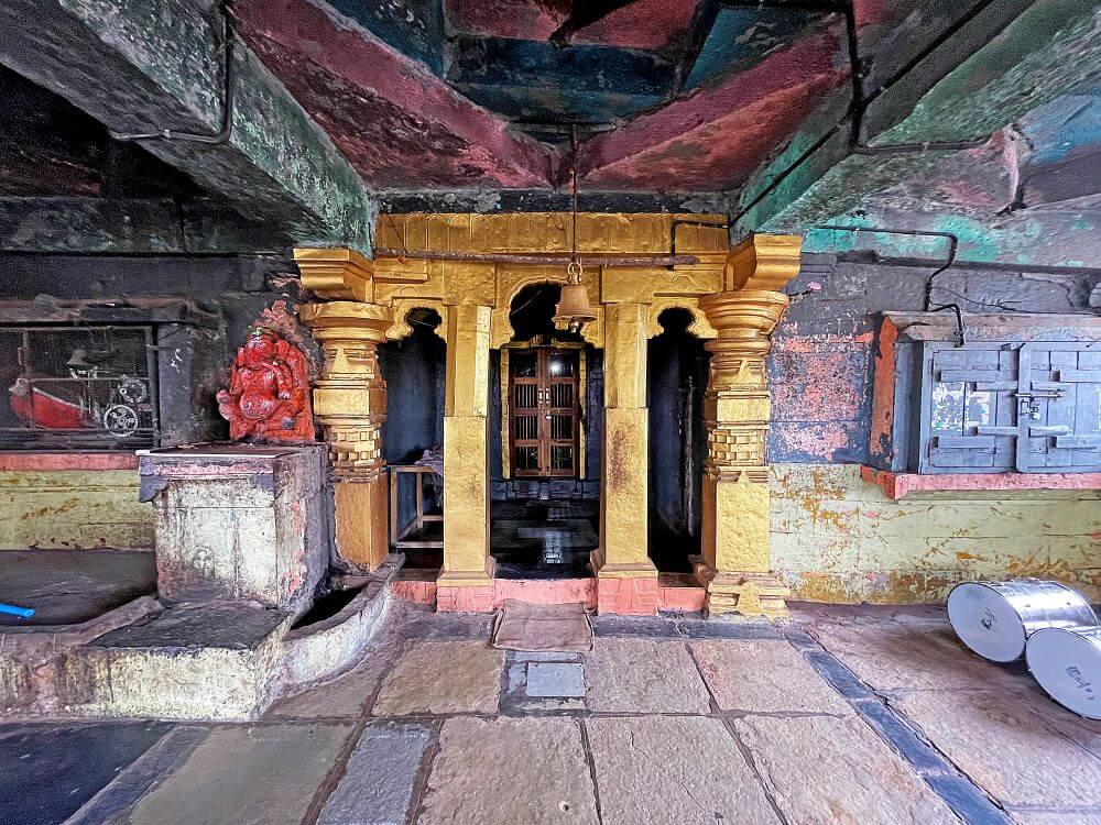 मुख्य मंदिरासमोर स्थानिक देवतेचे पाषाण असलेले एक मंदिर आहे. तीन मुखमंडप, सभामंडप, अंतराळ व गर्भगृह अशी या मंदिराची रचना आहे. मंदिराच्या दर्शनी मुखमंडपात एका मोठ्या चौथऱ्यावर तीन पाषाणी नंदी आहेत. यापैकी मध्यभागी असणाऱ्या नंदीच्या मूर्तीमध्ये शिवपिंडी कोरलेली आहे. हा नंदी आकाराने मोठा तर इतर दोन त्या तुलनेत काहीसे लहान आहेत. येथील सभामंडप अर्धखुल्या स्वरुपाचा आहे व त्यात भाविकांना बसण्यासाठी दगडी कक्षासने आहेत. सभामंडपात अंतराळाच्या दर्शनी भिंतीवर उजवीकडील चौथऱ्यावर प्राचीन गणेशमूर्ती आहे. या गणेशमूर्तीच्या समोरील बाजूस धुनी आहे. उत्सवकाळात ही धुनी सतत पेटती असते. अंतराळाच्या प्रवेशद्वाराजवळ चार दगडी स्तंभ महिरपी कमानीने एकमेकांशी जोडलेले आहेत. गर्भगृहात मध्यभागी चौकोनी स्वयंभू शिवपिंडीवर तीन उंचवटे आहेत. असे सांगितले जाते की ही तीन लिंगे शंकर, पार्वती व गणपती यांची प्रतिके आहेत.