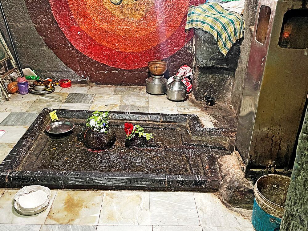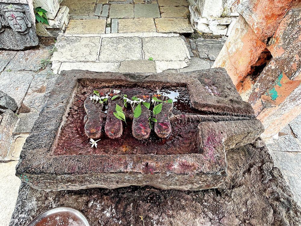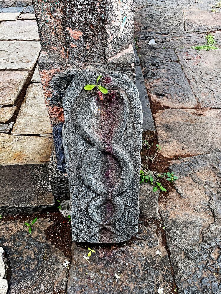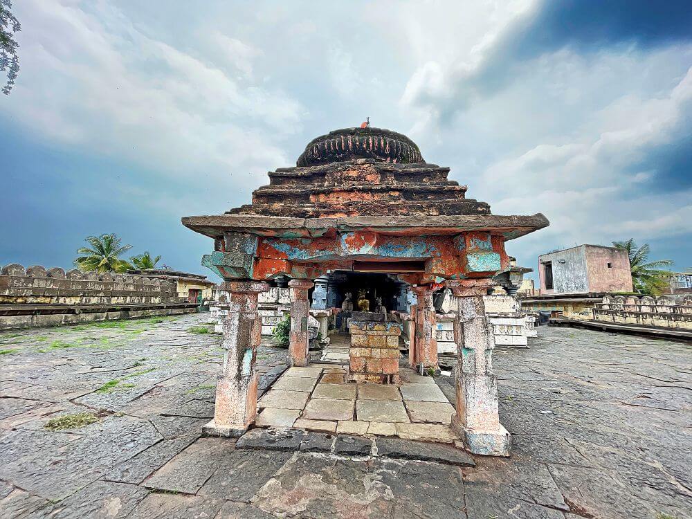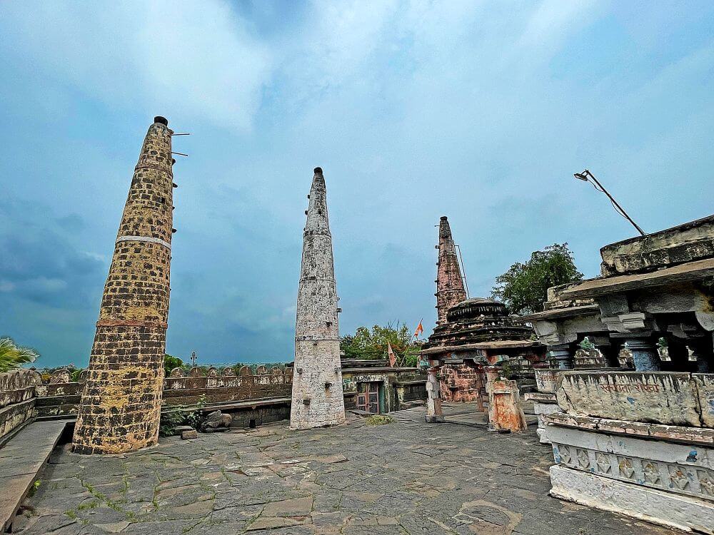 मुख्य मंदिरासमोर स्थानिक देवतेचे पाषाण असलेले एक मंदिर आहे. तीन मुखमंडप, सभामंडप, अंतराळ व गर्भगृह अशी या मंदिराची रचना आहे. मंदिराच्या दर्शनी मुखमंडपात एका मोठ्या चौथऱ्यावर तीन पाषाणी नंदी आहेत. यापैकी मध्यभागी असणाऱ्या नंदीच्या मूर्तीमध्ये शिवपिंडी कोरलेली आहे. हा नंदी आकाराने मोठा तर इतर दोन त्या तुलनेत काहीसे लहान आहेत. येथील सभामंडप अर्धखुल्या स्वरुपाचा आहे व त्यात भाविकांना बसण्यासाठी दगडी कक्षासने आहेत. सभामंडपात अंतराळाच्या दर्शनी भिंतीवर उजवीकडील चौथऱ्यावर प्राचीन गणेशमूर्ती आहे. या गणेशमूर्तीच्या समोरील बाजूस धुनी आहे. उत्सवकाळात ही धुनी सतत पेटती असते. अंतराळाच्या प्रवेशद्वाराजवळ चार दगडी स्तंभ महिरपी कमानीने एकमेकांशी जोडलेले आहेत. गर्भगृहात मध्यभागी चौकोनी स्वयंभू शिवपिंडीवर तीन उंचवटे आहेत. असे सांगितले जाते की ही तीन लिंगे शंकर, पार्वती व गणपती यांची प्रतिके आहेत.