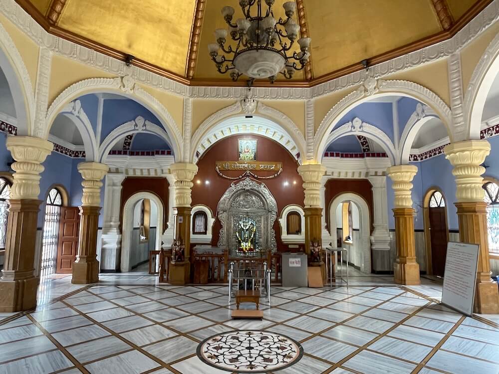 पुढे अर्धमंडपाचे प्रवेशद्वार आहे. अर्धमंडपात सभामंडपाच्या प्रवेशद्वाराच्या दोन्ही बाजूला दर्शनी भिंतीलगत असलेल्या चौथऱ्यांवर द्वारपाल शिल्पे आहेत. सभामंडपाच्या लाकडी प्रवेशद्वारात द्वारशाखांवर व त्यावरील तोरणात पानाफुलांच्या नक्षी आहेत. बंदिस्त स्वरूपाच्या सभामंडपात एकमेकांना अर्धचंद्राकार तोरणांनी जोडलेले नक्षीदार स्तंभ असून स्तंभांवर घुमटाकार छत आहे. छताला पितळी घंटा व काचेचे रोषणाईयुक्त झुंबर टांगलेले आहेत. सभामंडपात गर्भगृहाकडे डाव्या व उजव्या बाजूला आणखी दोन दरवाजे आहेत. गर्भगृहाच्या प्रवेशद्वारासमोर वज्रपिठावर नंदीची काळ्या पाषाणातील मूर्ती आहे.