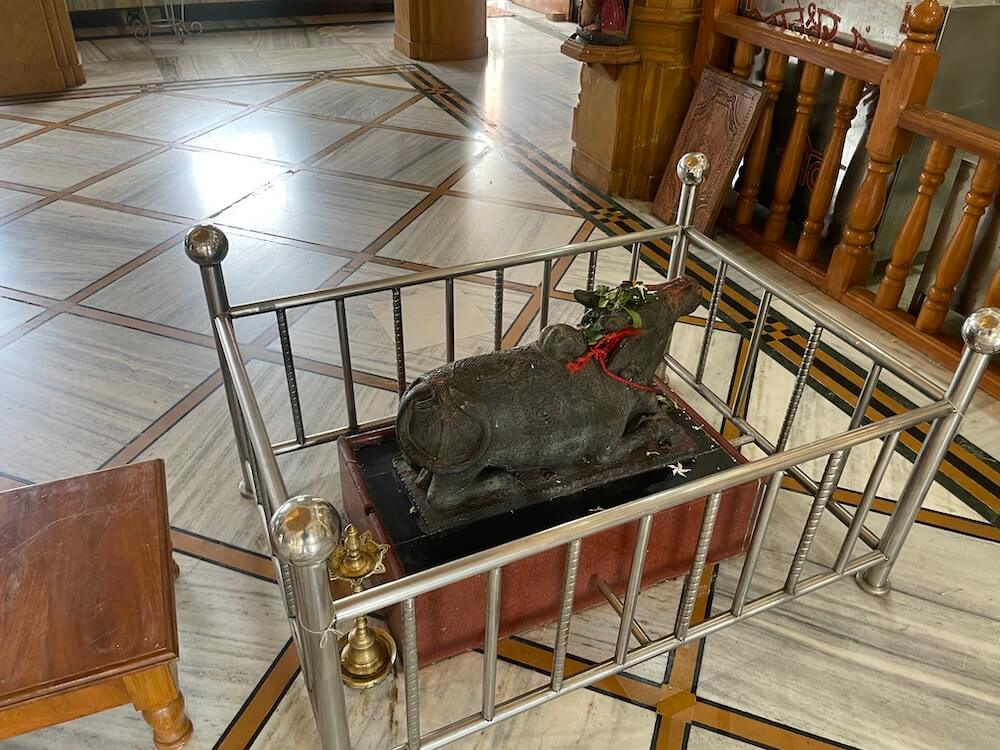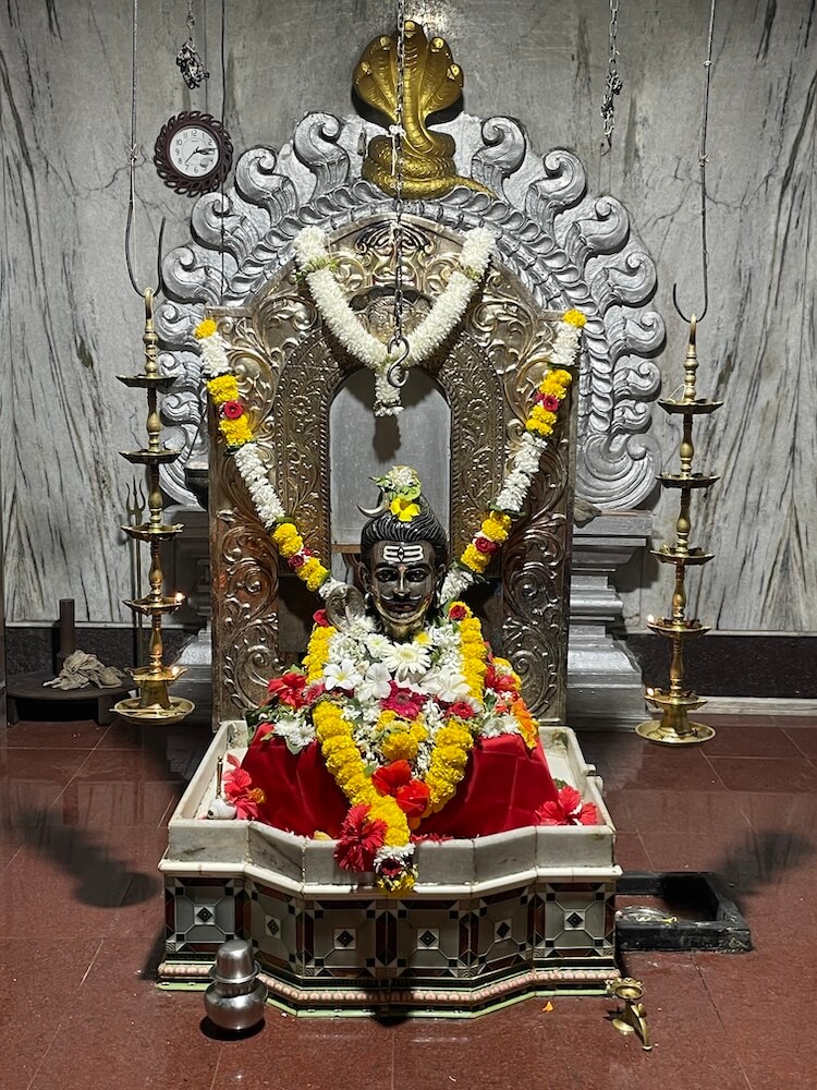 पुढे अर्धमंडपाचे प्रवेशद्वार आहे. अर्धमंडपात सभामंडपाच्या प्रवेशद्वाराच्या दोन्ही बाजूला दर्शनी भिंतीलगत असलेल्या चौथऱ्यांवर द्वारपाल शिल्पे आहेत. सभामंडपाच्या लाकडी प्रवेशद्वारात द्वारशाखांवर व त्यावरील तोरणात पानाफुलांच्या नक्षी आहेत. बंदिस्त स्वरूपाच्या सभामंडपात एकमेकांना अर्धचंद्राकार तोरणांनी जोडलेले नक्षीदार स्तंभ असून स्तंभांवर घुमटाकार छत आहे. छताला पितळी घंटा व काचेचे रोषणाईयुक्त झुंबर टांगलेले आहेत. सभामंडपात गर्भगृहाकडे डाव्या व उजव्या बाजूला आणखी दोन दरवाजे आहेत. गर्भगृहाच्या प्रवेशद्वारासमोर वज्रपिठावर नंदीची काळ्या पाषाणातील मूर्ती आहे.