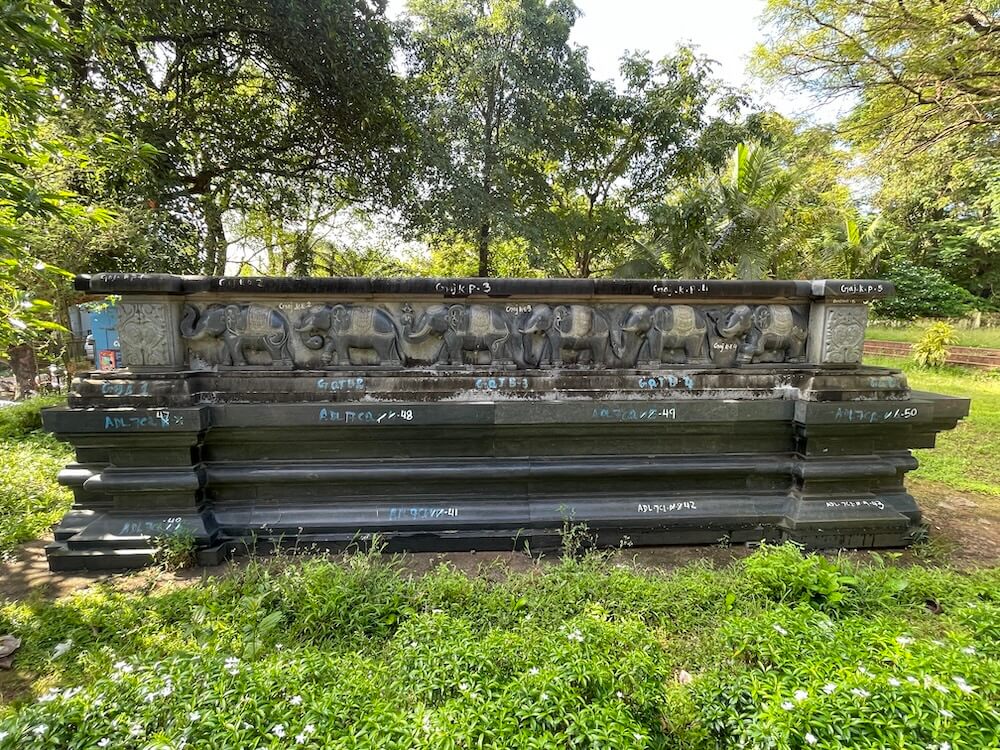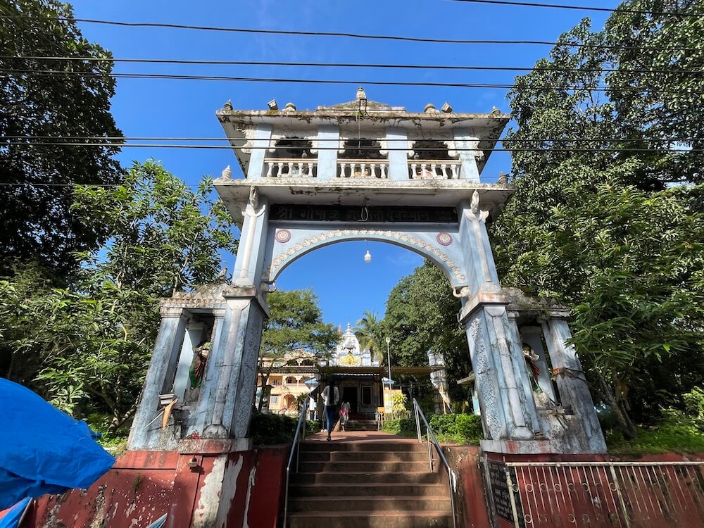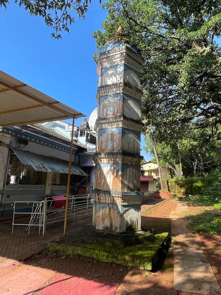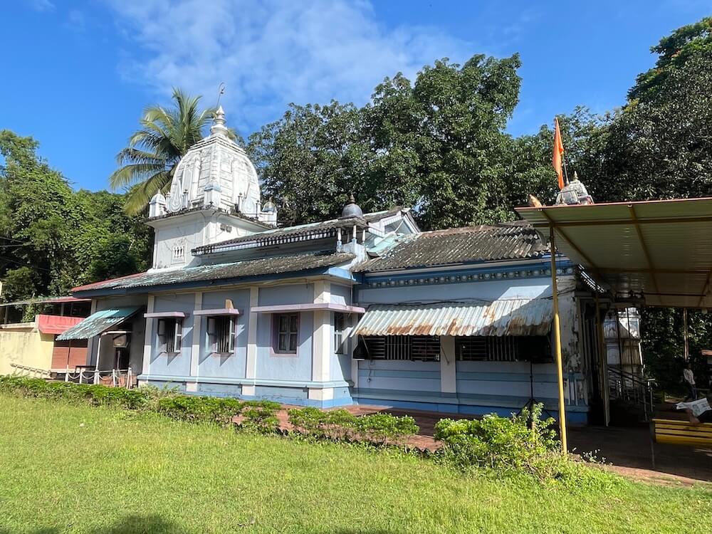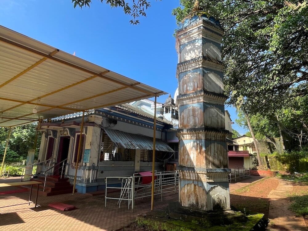 मुख्य मार्ग से ऊँचे स्थल पर स्थित इस मंदिर के प्रांगण में सोपानों के माध्यम से प्रवेश करना होता है। सोपानों के प्रारंभ में ही एक भव्य प्रवेश द्वार है। उसके दोनों स्तंभों के समीप निर्मित छोटे मंडपों में द्वारसेविकाओं की प्रतिमाएँ उत्कीर्ण हैं। प्रवेश द्वार के शीर्ष पर गणेश की प्रतिमा विराजमान है। सोपानों से ऊपर आने पर बाईं ओर हरित घास के मैदान पर प्राचीन मंदिर के अवशेष के रूप में एक विशाल पत्थरभित्ति दिखाई देती है। यह मंदिर की जगती का भाग है जिस पर हाथियों की पंक्ति अंकित है। यहाँ से कुछ दूरी पर ऊँचे अधिष्ठान पर मंदिर का भवन निर्मित है। मंदिर के सम्मुख स्थित चबूतरे पर धातु की चादरों का मंडप है। दक्षिण दिशा में छह स्तरों का चौकोर दीपस्तंभ स्थित है। मंदिर का निर्माण गोमंतकीय स्थापत्य शैली में किया गया है। इसमें छोटे सभामंडप, महामंडप और गर्भगृह की संरचना है। सभामंडप और महामंडप पर ढालू खपरैल की छत है। गर्भगृह के ऊपर गोमंतकीय और नागर स्थापत्य शैली के समन्वय से निर्मित शिखर है। इस शिखर का निचला भाग चौकोर है और उस पर नागर शैली का चारों दिशाओं से क्रमशः संकुचित होता हुआ उरुशृंग प्रकार का शिखर है। उसके शीर्ष पर आमलक और कलश सुशोभित हैं। सभामंडप की दीवारों में विशाल खिड़कियाँ हैं। दोनों ओर बैठने के स्थान हैं।