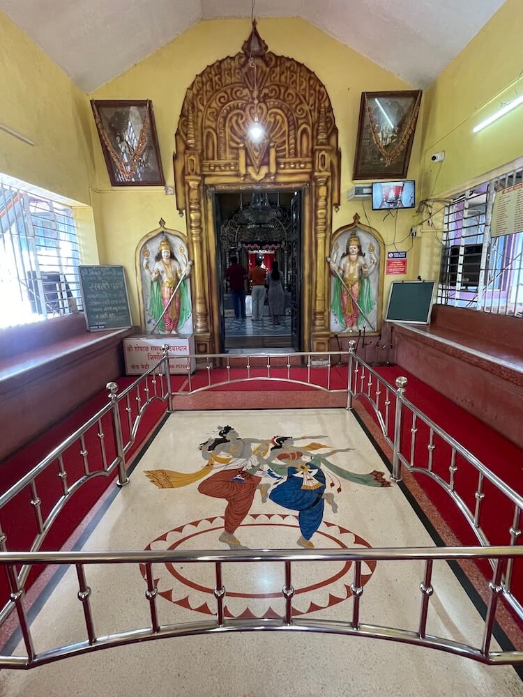 मंदिर के महामंडप में एक नक्काशीदार प्रवेश द्वार है, जिसके ललाट-बिंब पर ओंकार उत्कीर्ण है। प्रवेश द्वार के दोनों पार्श्वों में वैष्णव द्वारपालों की दो सुंदर नक्काशीदार प्रतिमाएँ हैं। उनके ऊपरी भाग में गणेश के श्वेत-श्याम चित्र सुसज्जित हैं। महामंडप के स्तंभ भी शिल्पकारी से अलंकृत हैं। इन स्तंभों पर देवी-देवताओं एवं यक्ष-यक्षिणी की प्रतिमाएँ उत्कीर्ण हैं। छत से पीतल के घंटे एवं स्फटिक के झूमर लटक रहे हैं। गर्भगृह का प्रवेश द्वार भी सूक्ष्म नक्काशी से सज्जित है। अंतर्भाग में ऊँचे अधिष्ठान पर रजत निर्मित गोपाल गणेश की प्रतिमा विराजमान है। प्रतिमा के सम्मुख दोनों ओर ऊँचे दीपाधार स्थापित हैं।