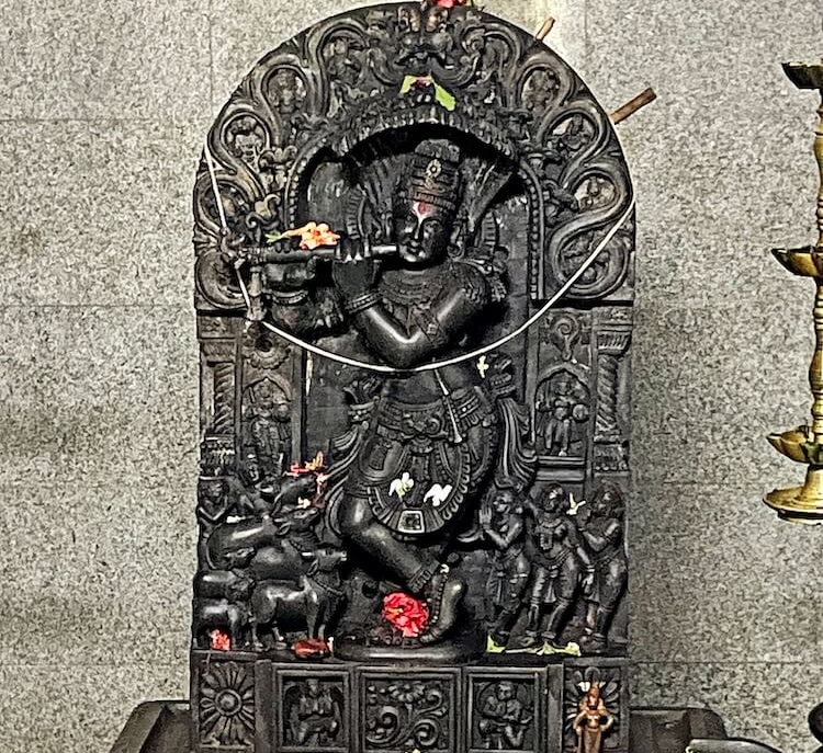 ]मोठी गवाक्षे असलेला अर्धखुला सभामंडप, अंतराळ आणि प्रदक्षिणा मार्ग असलेले गर्भगृह अशी येथील मंदिराची संरचना आहे. मंदिराच्या गर्भगृहात वज्रपिठावर स्थापित असलेली मुरलीधारी श्रीकृष्णाची मूर्ती अतिशय रेखीव आहे. एका अखंड शिळेतून घडविण्यात आलेल्या या कोरीव मूर्तीवर सुंदर नक्षीकाम आहे. त्रिभंग पद्धतीची म्हणजे तीन ठिकाणी बाक असलेली ही मूर्ती आहे. कृष्णाच्या पायाशी एका बाजुला गोधन म्हणजे गायीगुरे चित्रित करण्यात आलेली दिसतात. गोव्यातील इतर अनेक जुन्या मंदिरांप्रमाणे, गर्भगृहावरील शिखर वगळता मंदिराच्या इतर भागाच्या छतावर कौले आहेत. गर्भगृहावर सिमेंटचा वापर करून उभारण्यात आलेले षटकोनी शिखर आहे.