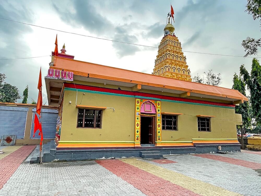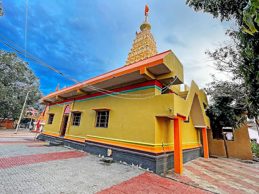 गावाजवळ असलेल्या या मंदिरास भक्कम तटबंदी आहे. या तटबंदीतील प्रवेशद्वारात डाव्या व उजव्या बाजूला दोन चौथरे आहेत. या दोन्ही चौथऱ्यांवर प्रत्येकी चार नक्षीदार स्तंभ आहेत. हे दोन्ही बाजूचे स्तंभ महिरप कमानीने जोडलेले आहेत आणि त्या स्तंभांवर सज्जे आहेत. या सज्जावर डाव्या व उजव्या बाजूला दोन आमलक आहेत. या दोन्ही आमलकांच्या मधे सलग तीन मेघडंबरी आहेत, ज्यात ब्रह्मा, विष्णू व महादेव यांच्या मूर्ती आहेत. मंदिराच्या प्रशस्त प्रांगणात विविध प्रकारचे वृक्ष आहेत. तसेच मागील बाजूला कोरीव पाषाणात बांधलेली प्राचीन विहीर आहे. येथेच शुचिर्भूत होऊन दर्शनाला जाण्याची जुनी प्रथा आहे.