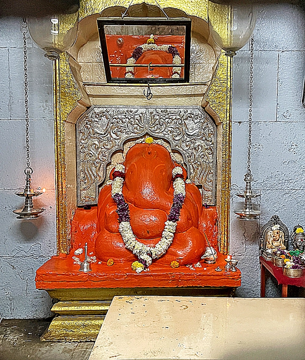 या मंदिराच्या प्रवेशद्वारावर दक्षिणाभिमुख नगारखाना आहे. प्रशस्त प्रांगणात डाव्या बाजूला उत्तराभिमुख सभामंडप आणि गर्भगृह आहे, तर उजव्या बाजूला मोठी ओसरी आणि त्याला लागूनच दीक्षित कुटुंबीयांचे निवासस्थान आहे.गर्भगृहातील गणपतीची मूर्ती मूळ काळ्या पाषाणाची आहे. त्याला शेंदूर लेपाने आकार देण्यात आला आहे. डाव्या सोंडीचे, चतुर्भुज आणि मांडी घातलेले गणेशाचे हे रूप तीन फूट उंच मूर्तीत प्रकट झाले आहे. गर्भगृहाच्या मागे शमीचे मोठे झाड असून तेही मंदिराएवढेच जुने असल्याची मान्यता आहे. येथील शंकूच्या आकाराचे ३० फूट उंचीचे शिखर सुंदर रंगवलेले आहे.