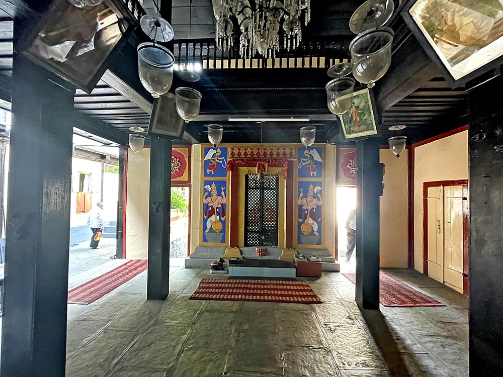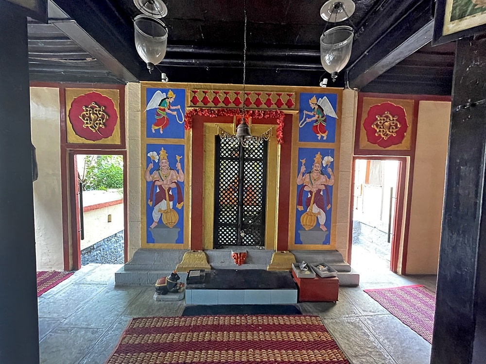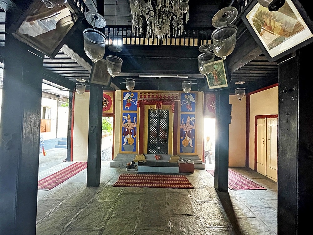 मंदिरातील सभामंडप आता दुमजली असून सागवानी लाकडी छताचा मधला भाग दुप्पट उंचीवर आहे. दुसऱ्या मजल्याला सागवानी लाकडी खांबांचाच आधार देण्यात आला आहे. लाकडी वास्तुशैलीने मंदिराच्या सौंदर्यात भर पडली आहे. येथील छताला अडकवलेल्या हंड्या व झुंबरदेखील मंदिराची शोभा वाढवतात. मंदिराच्या सभामंडपावर सध्या लोखंडी पत्रे टाकण्यात आलेले आहेत. येथील भिंतींवर पौराणिक धार्मिक कथांवर आधारलेली सुंदर चित्रे असून प्रसिद्ध चित्रकार राजा रवी वर्मा यांनी ही काढलेली असल्याचे सांगितले जाते. १९६१ च्या पुरात ही चित्रे सुरक्षित राहिली. पेशवेकालीन वास्तुशैलीतील इतर मंदिरांप्रमाणेच येथील भिंतीही मातीच्या विटांपासूनच बनवण्यात आल्या आहेत.