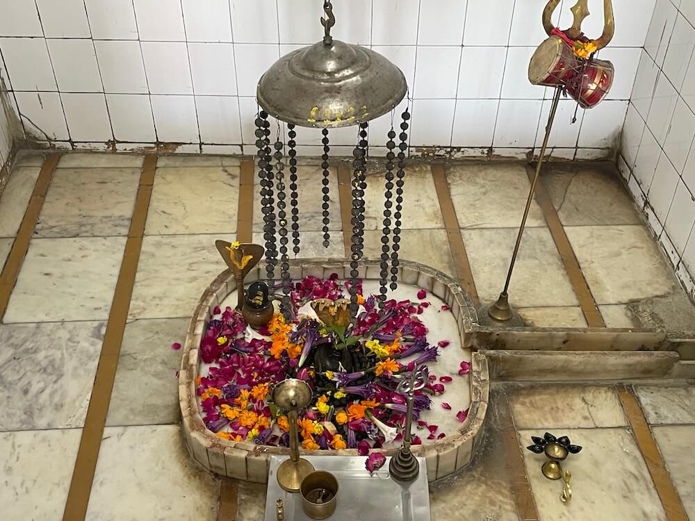 with a tortoise in front. In the antaral are the idols of Ganapati and Hanuman. A few steps descend into the sanctum, where upon the ground rests the Shivling of Siddheshwar Mahadev, enclosed by a small marble railing. A serpent spreads its hood protectively above the Shivling. Nearby is another small Shivling and in the shrine behind stands the idol of Parvati.