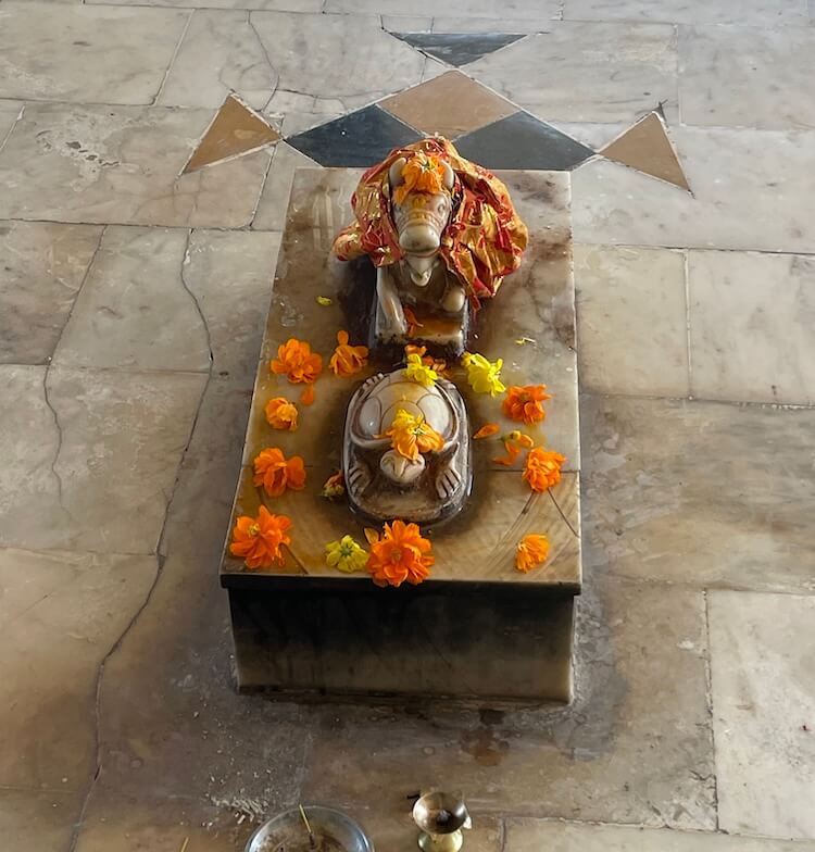 with a tortoise in front. In the antaral are the idols of Ganapati and Hanuman. A few steps descend into the sanctum, where upon the ground rests the Shivling of Siddheshwar Mahadev, enclosed by a small marble railing. A serpent spreads its hood protectively above the Shivling. Nearby is another small Shivling and in the shrine behind stands the idol of Parvati.