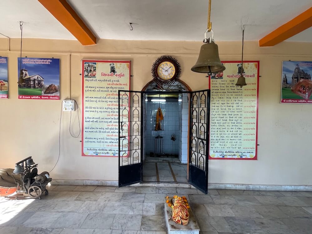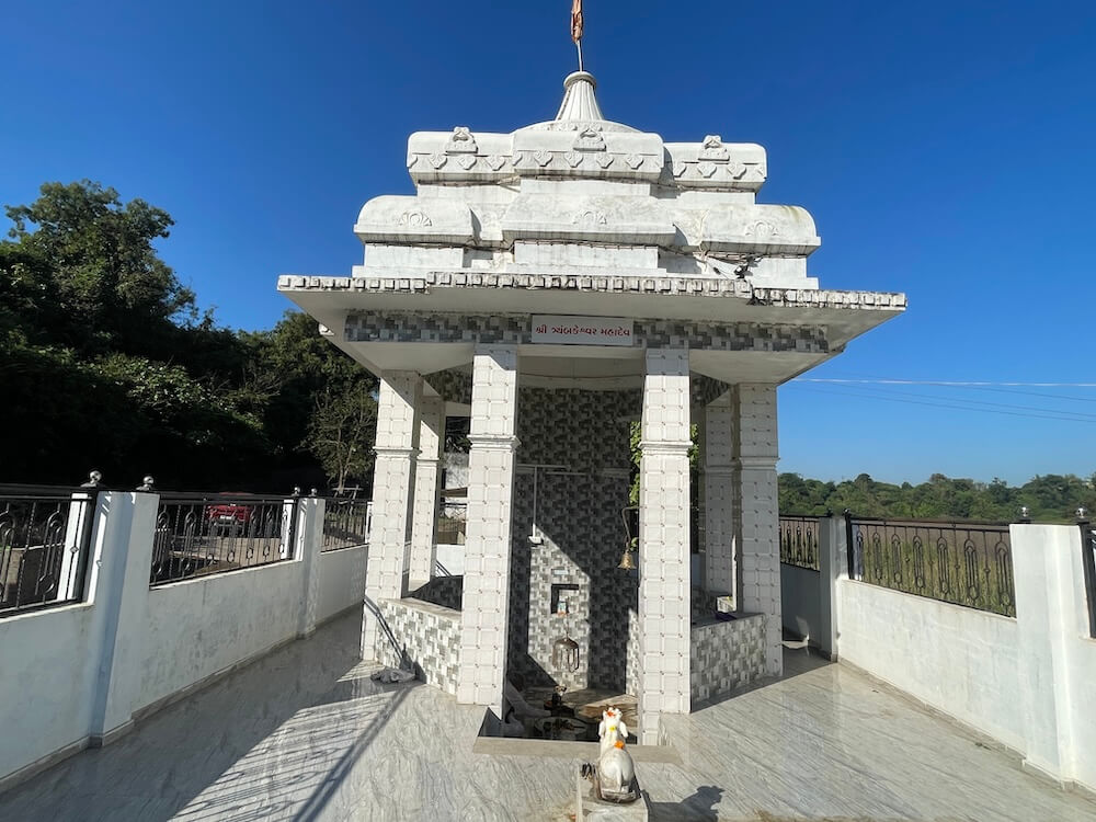 Sarsad is a small village about 20 kilometres from Jhagadia. A little distance from the village, at the foot of a small hillock, lies this Gupt Godavari Tirth, with the Trimbakeshwar Mahadev Temple standing nearby. The modest temple, built in modern style, rests on a raised plinth. Four steps lead into the courtyard enclosed by a parapet on all sides. Upon a small platform ahead stands a marble idol of Nandi, with a tortoise before it. The sanctum is semi-open; its pillars and lower parapets are lined with tiles.