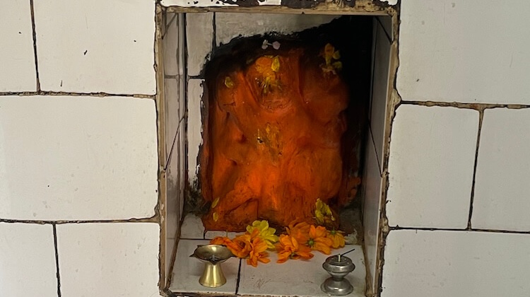 The sanctum itself lies slightly lower than the outer courtyard. As at Trimbakeshwar, three Shivlings symbolising Brahma, Vishnu and Mahesh are installed within, sheltered beneath a serpent’s hood. Beside them stands another Shivling, all crowned with small silver canopies. Above the sanctum rises a shikhara influenced by the southern Gopuram style, its upper portion shaped like an inverted chalice, crowned with amalak and kalash. To the right of the temple, at the foot of the hill, are two small Kundas (tanks). Affixed to the hillside wall are the stone Gomukh and Vyaghramukh, from which flows the water believed by devotees to be the hidden Godavari. The primary shrine of Godavari Mata is located nearby.