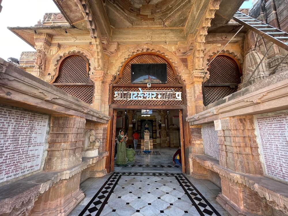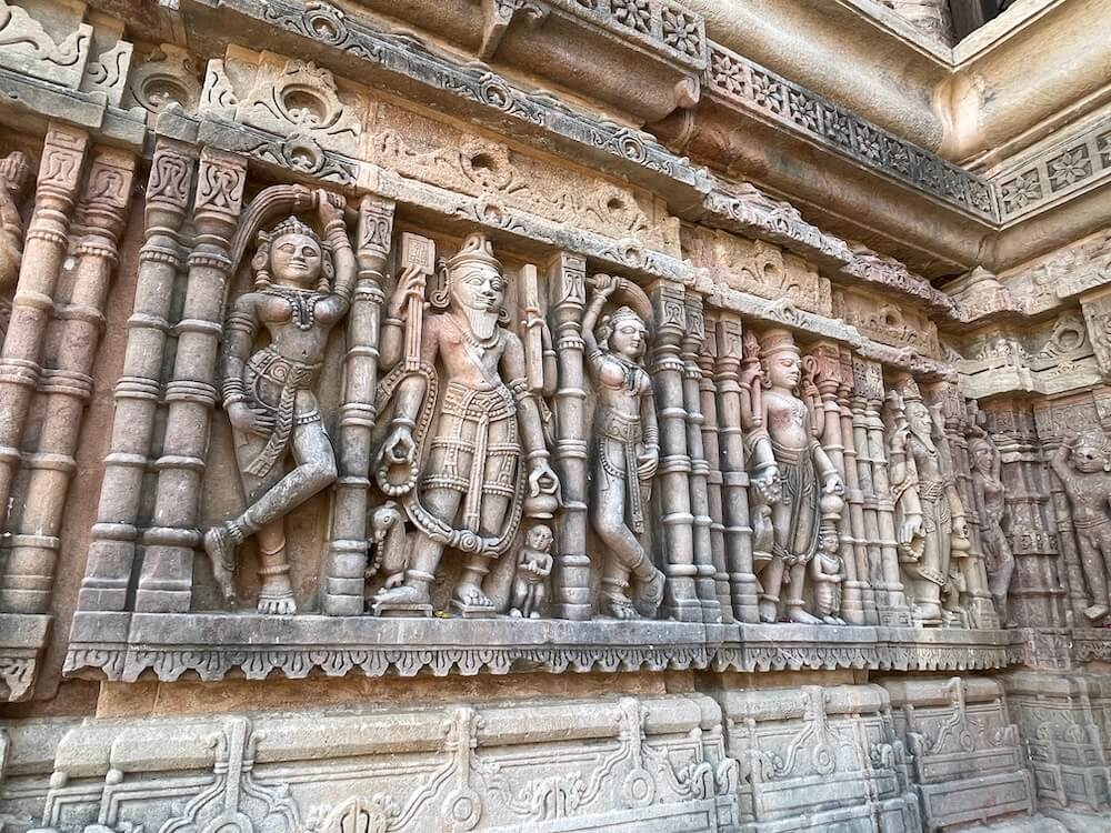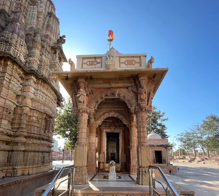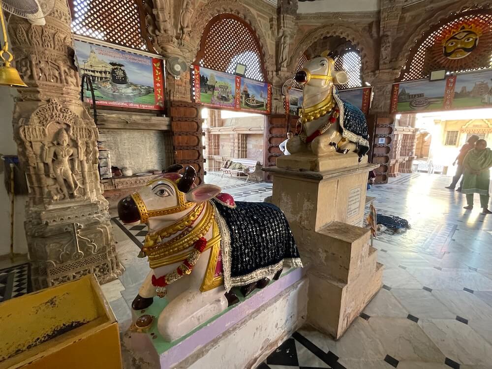 The temple precinct is large. Visitors descend steps into a spacious courtyard. The temple sits on a high pedestal, made from red and yellow sandstone. It includes a ‘Mukhamandapa’ (entrance porch), a ‘Sabhamandapa’ (assembly hall), an ‘Antarala’ (vestibule) and the ‘Garbhagriha’ (sanctum sanctorum). The main entrance faces east. There are also portals from the south and north. The assembly hall’s columns and ceilings have intricate carvings and sculptures. Two large idols of Nandi are on a grand platform. Unlike most Shiva temples, where the tortoise sculpture comes before Nandi, here it is behind the sacred bull. In the vestibule, Ganesha is to the left and Kartikeya to the right. The doors to Kartikeya’s shrine open only on Kartik Purnima. At the sanctum entrance,