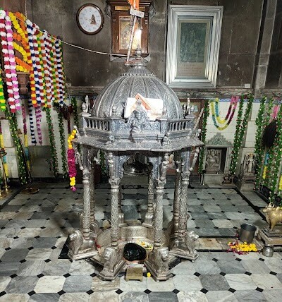 ‘Kirtimukhas’ (glory masks) are carved. The Shivalinga is rooted in the netherworld, so one descends steps to the octagonal ‘Shalunka’ (base) housing the deity. This base has ornate silver sheeting. From the New Moon of Ashadh until the eleventh day of Kartik, a silver ‘Bangla’ (pavilion) is arranged around the Shivalinga. Behind the lingam, a niche in the wall houses Mother Parvati.
