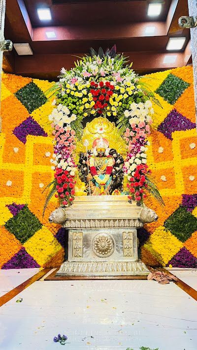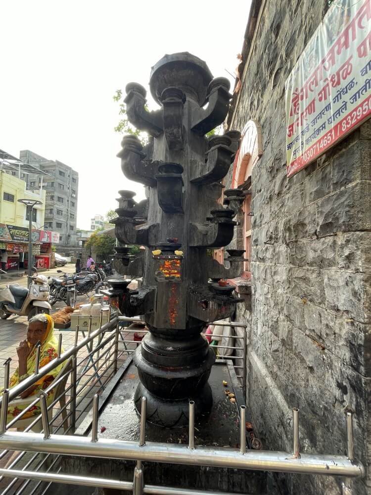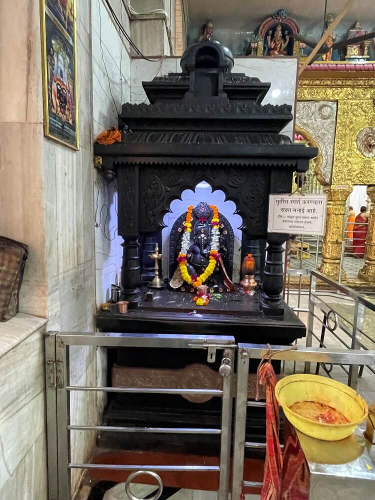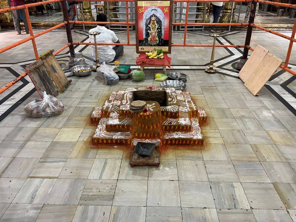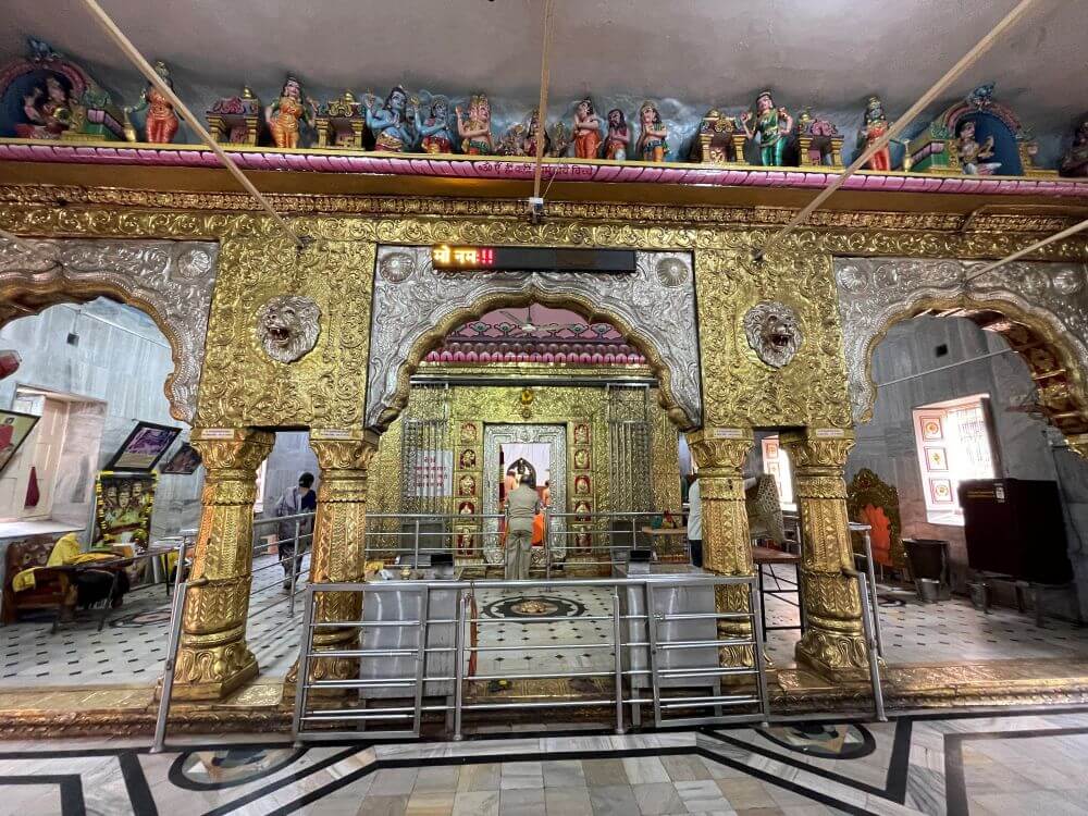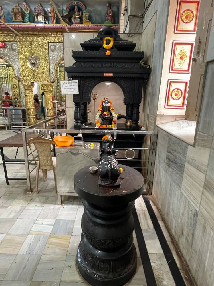 बंदिस्त सभामंडपात प्रकाश व हवा येण्यासाठी खाली व वर अशा वातायनांच्या दोन रांगा आहेत. उजव्या व डाव्या बाजूच्या भिंतींत आणखी दोन दरवाजे आहेत. सभामंडपात भाविकांना बसण्यासाठी आसने आहेत. मुख्य प्रवेशद्वारासमोर चौथऱ्यावर सिंह शिल्प व मध्यभागी जमिनीवर यज्ञकुंड आहे. सभामंडपात अंतराळाच्या दोन्ही बाजूला दोन मेघडंबरी आहेत. त्यापैकी डाव्या बाजूच्या मेघडंबरीत गणपती व उजव्या बाजूच्या मेघडंबरीत शिवपिंडी आहे. अंतराळाच्या प्रवेशद्वारास आडव्या रांगेत सहा गोलाकार स्तंभ आहेत. हे सर्व स्तंभ एकमेकांना महिरपी कमानीने जोडलेले आहेत. अंतराळाच्या प्रवेशद्वारावरील स्तंभ व कमानी धातू अच्छादीत आहेत. त्यांवर विविध प्रकारची नक्षी व सिंहशिल्पे आहेत. अंतराळाच्या भिंतीवरील सज्जावर विविध देवीदेवतांची शिल्पे आहेत. अंतराळात मध्यभागी गर्भगृह आहे. गर्भगृहाच्या दर्शनी भिंती सुवर्णधातू आच्छादित आहेत. त्यांवर विविध प्रकारचे नक्षीकाम आहे. गर्भगृहाच्या प्रवेशद्वाराच्या द्वारशाखांवर अष्टदुर्गा नक्षी व ललाटबिंबावर गणपतीची मूर्ती आहे. प्रवेशद्वारावर मयूर तोरणात गजलक्ष्मीची मूर्ती आहे. प्रवेशद्वारास चांदीच्या नक्षीदार झडपा व त्याखाली चांदीचे मंडोरक आहे.