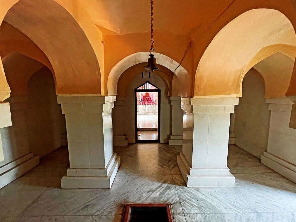 या मंदिराच्या काहीशा लहान असलेल्या सभामंडपात भलेमोठे दगडी स्तंभ आहेत व हे सर्व स्तंभ एकमेकांशी महिरपी कमानीने जोडलेले आहेत. सभामंडपात हवनकुंड व देवीचे वाहन असलेल्या सिंहाच्या दोन मूर्ती आहेत. सभामंडप व अंतराळामध्ये सुमारे पाच फूट रुंदीची एक मोठी दगडी भिंत आहे. या भिंतीतील चिंचोळ्या मार्गातून अंतराळात प्रवेश होतो. अंतराळात गर्भगृहापुढे मोठी स्टेनलेस स्टिलची जाळी लावलेली आहे. येथून भाविकांना गर्भगृहातील हिरामाता देवीच्या मूर्तीचे दर्शन घ्यावे लागते. गर्भगृहात एका मोठ्या वज्रपिठावरील मखरात देवीची तांदळा स्वरूपातील स्वयंभू मूर्ती आहे. या मूर्तीचे डोळे व भूवया चांदीच्या आहेत.