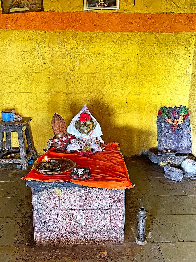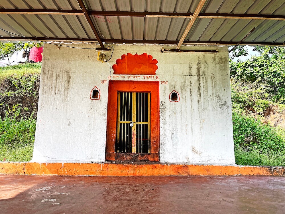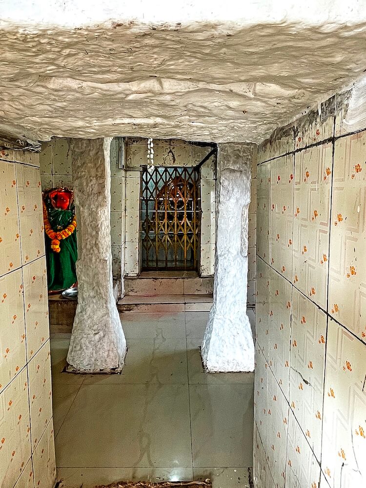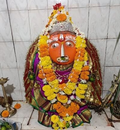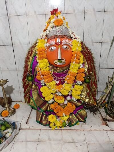 सभामंडप व गर्भगृह अशी रचना असलेल्या मंदिराच्या सभामंडपाच्या प्रवेशद्वारासमोर चौकोनी कोरीव पाषाणावर देवीची पावले कोरलेली आहेत. प्रवेशद्वाराच्या डावीकडे दर्शनी भिंतीलगत गणेशाची शेंदूरचर्चित पाषाणी मूर्ती आहे. सभामंडपात दोन नक्षीदार चौकोनी स्तंभ आहेत.