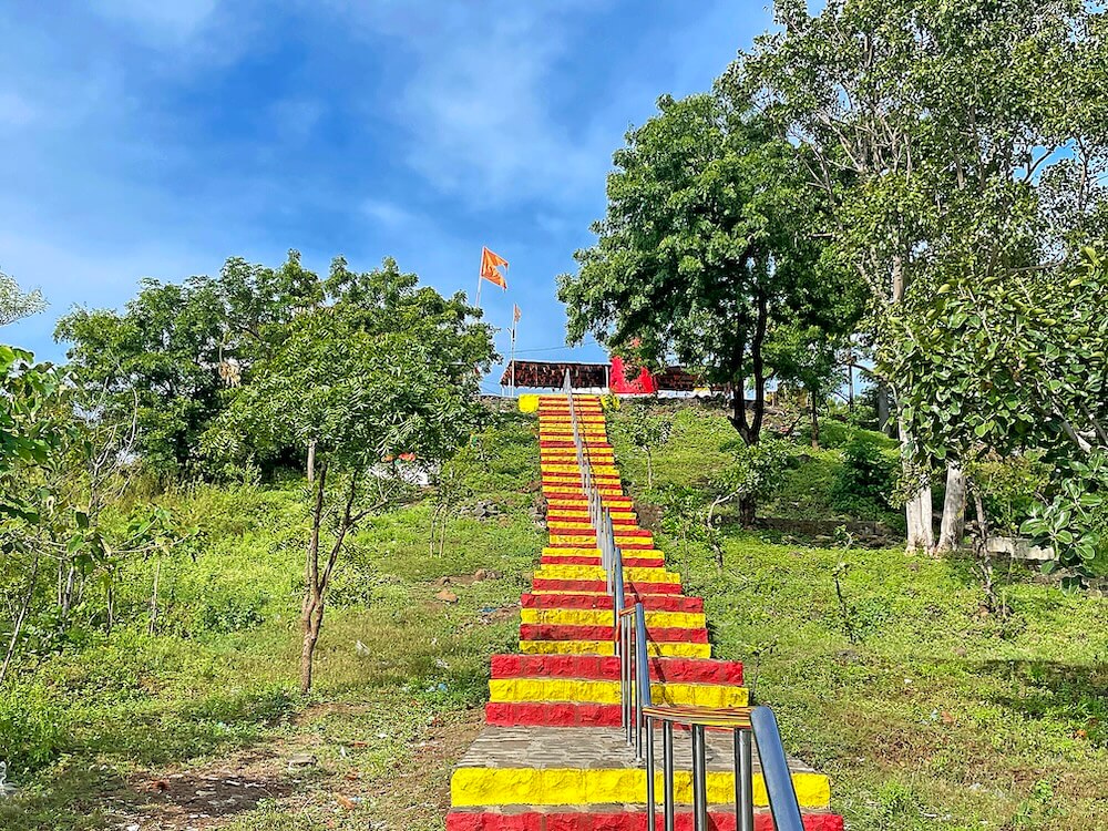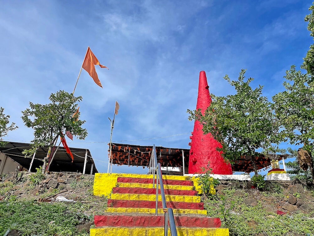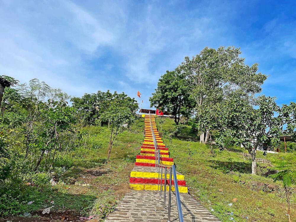 डोंगरगाव येथील डोंगरमाथ्यावरील मंदिराकडे येण्यासाठी कोरीव पाषाणात बांधलेल्या सुमारे साठ पायऱ्या आहेत. पायऱ्यांच्या मधोमध वरपासून खालपर्यंत स्टेनलेस स्टीलचा सुरक्षा कठडा लावलेला असल्याने वर जाण्यासाठी व खाली येण्यासाठी असे दोन स्वतंत्र पायरीमार्ग तयार झाले आहेत. लाल, पिवळ्या तैलरंगाने रंगवलेल्या या पायऱ्या हळदी-कुंकवाचे सडे ल्यायल्यासारख्या दिसतात. पायऱ्या चढून वर आल्यावर मंदिराच्या पेव्हर ब्लॉक आच्छादित प्रांगणात प्रवेश होतो. प्रांगणात मंदिरासमोर सुमारे तीस फूट उंचीचा पाषाणी दीपस्तंभ आहे. प्रांगणात मंदिरासमोर लोखंडी स्तंभांवर पत्र्याचे छत असलेला रांगमंडप आहे व येथेच भाविकांना बसण्यासाठी आसनांची व्यवस्था आहे. येथील पुजाऱ्यांच्या म्हणण्यानुसार, हे हेमाडपंती शैलीचे दगडी बांधकाम असलेले मंदिर सुमारे सोळाव्या शतकातील असावे.