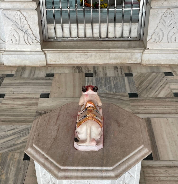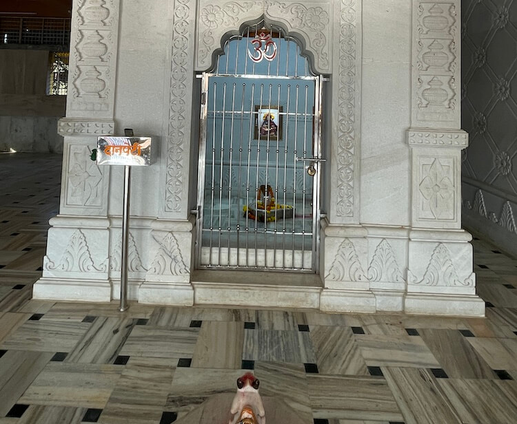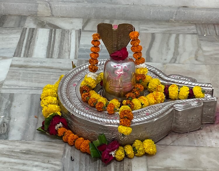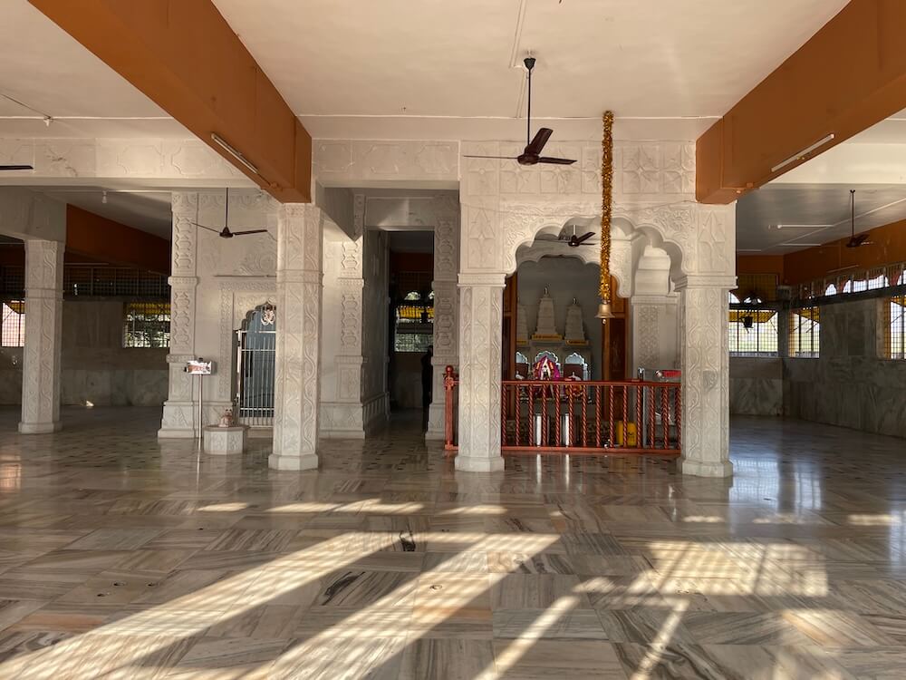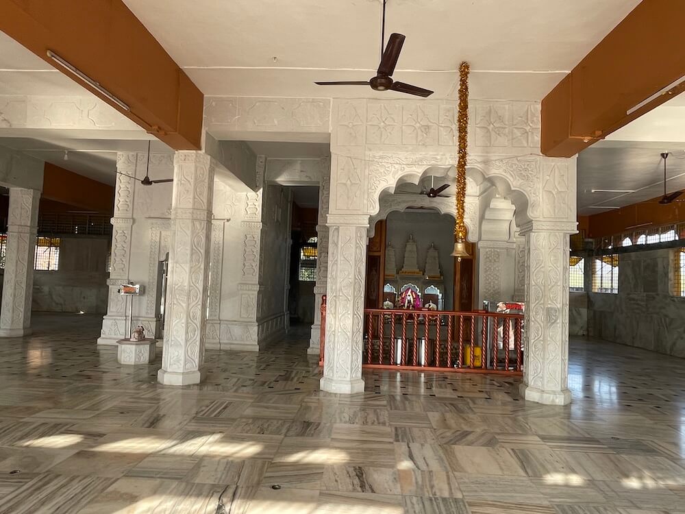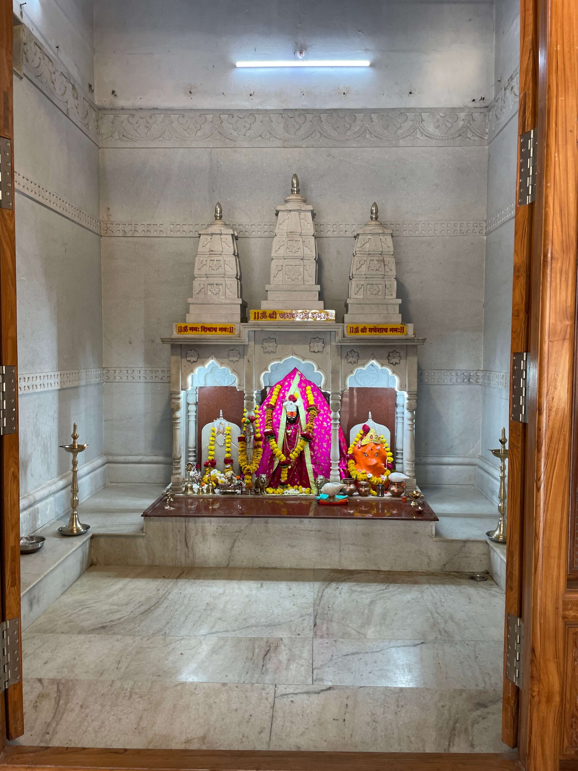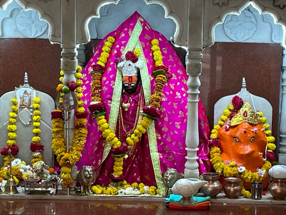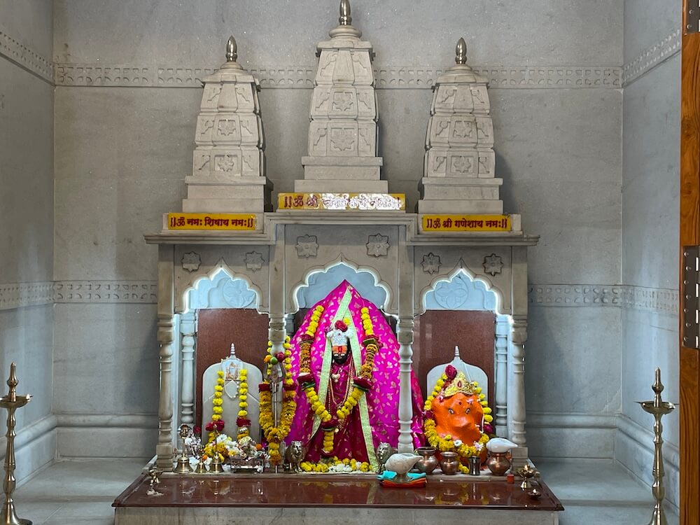 मुख्य गर्भगृहाला महिरपी कमानीचे प्रवेशद्वार आहे आणि आत तीन मोठ्या संगमरवरी मखरांमध्ये मध्यभागी देवीची काळ्या पाषाणातील मूर्ती आहे. तीन फूट उंचीच्या या चतुर्भुज मूर्तीच्या हातांत शंख, चक्र, गदा, पद्म आहेत. या मुकुटधारी मूर्तीच्या दोन्ही बाजूंना दोन राक्षस आहेत आणि समोर सिंहाच्या दोन मूर्ती आहेत. देवीच्या डावीकडील मखरात नागदेवतेची चांदीची मूर्ती तर उजवीकडील मखरात गणेशाची मूर्ती विराजमान आहे. या मंदिरातील दुसऱ्या गर्भगृहात शिवलिंग आहे. या गर्भगृहासमोर नंदीची मूर्ती आहे. गर्भगृहातील शाळुंका तसेच पिंडीवर चांदीच्या पत्र्याचे आवरण आहे आणि वरच्या भागात असलेल्या गलंतिकेतून पिंडीवर अभिषेक होत असतो. येथील देवकोष्ठकांमध्ये पार्वतीमाता तसेच गणेशाचे स्थान आहे. मंदिरात हनुमानाचीही मूर्ती आहे. दोन्ही गर्भगृहांवरील आधुनिक पद्धतीची उंच शिखरे संगमरवरी फरशा वापरून उभारण्यात आली आहेत.