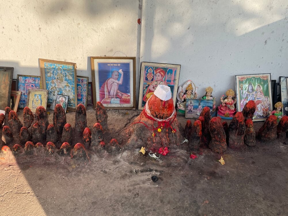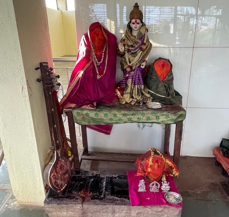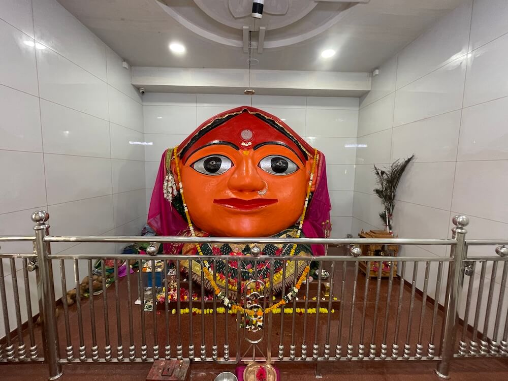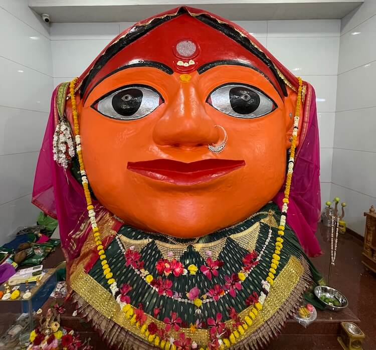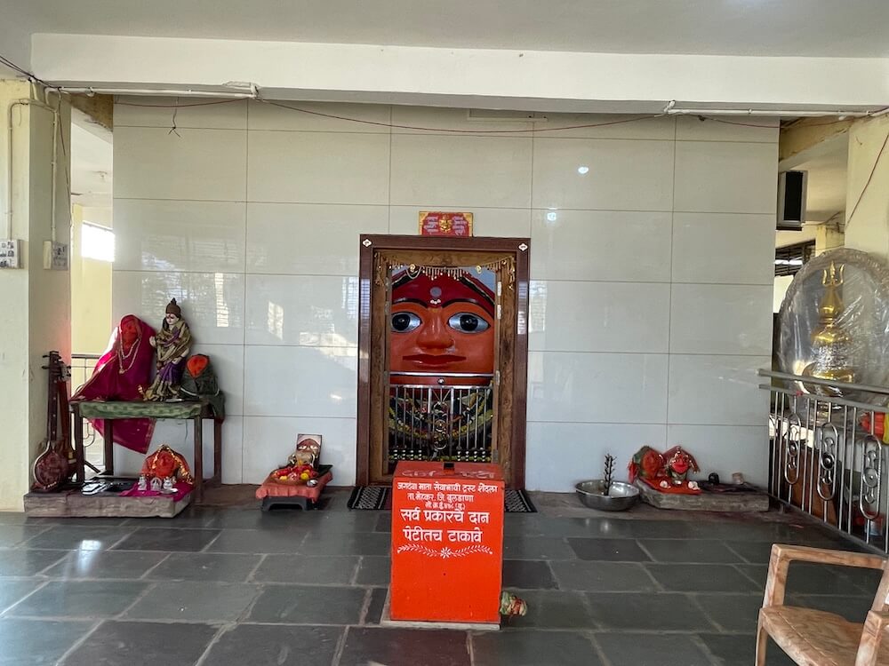 गर्भगृहात देवीची भव्य शेंदूरचर्चित मूर्ती आहे. या मूर्तीवर भुवया, डोळे, नाक, ओठ व कान स्पष्टपणे कोरलेले आहेत. देवीच्या नाकात चांदीची नथ आहे. या वस्त्रालंकारविभूषित देवीच्या चरणांजवळ शिवलिंग व पादुका आहेत.